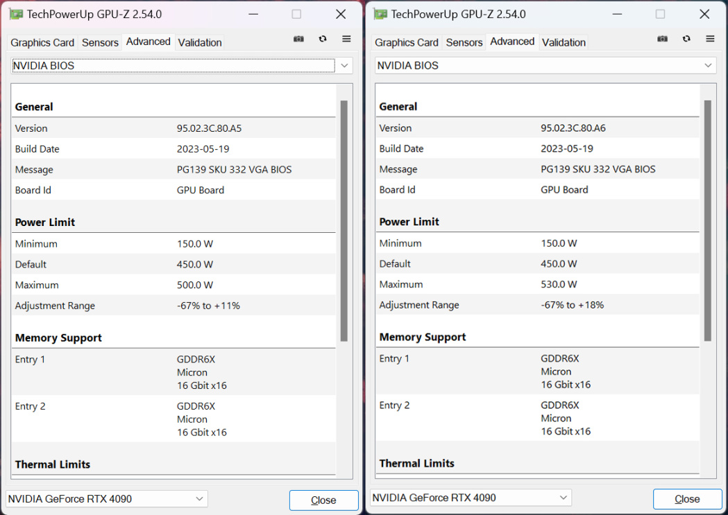 在不同Bios 下功耗也略有不同,高频Bios 版本下最大功耗解锁到530W,相比默认更多了30W。