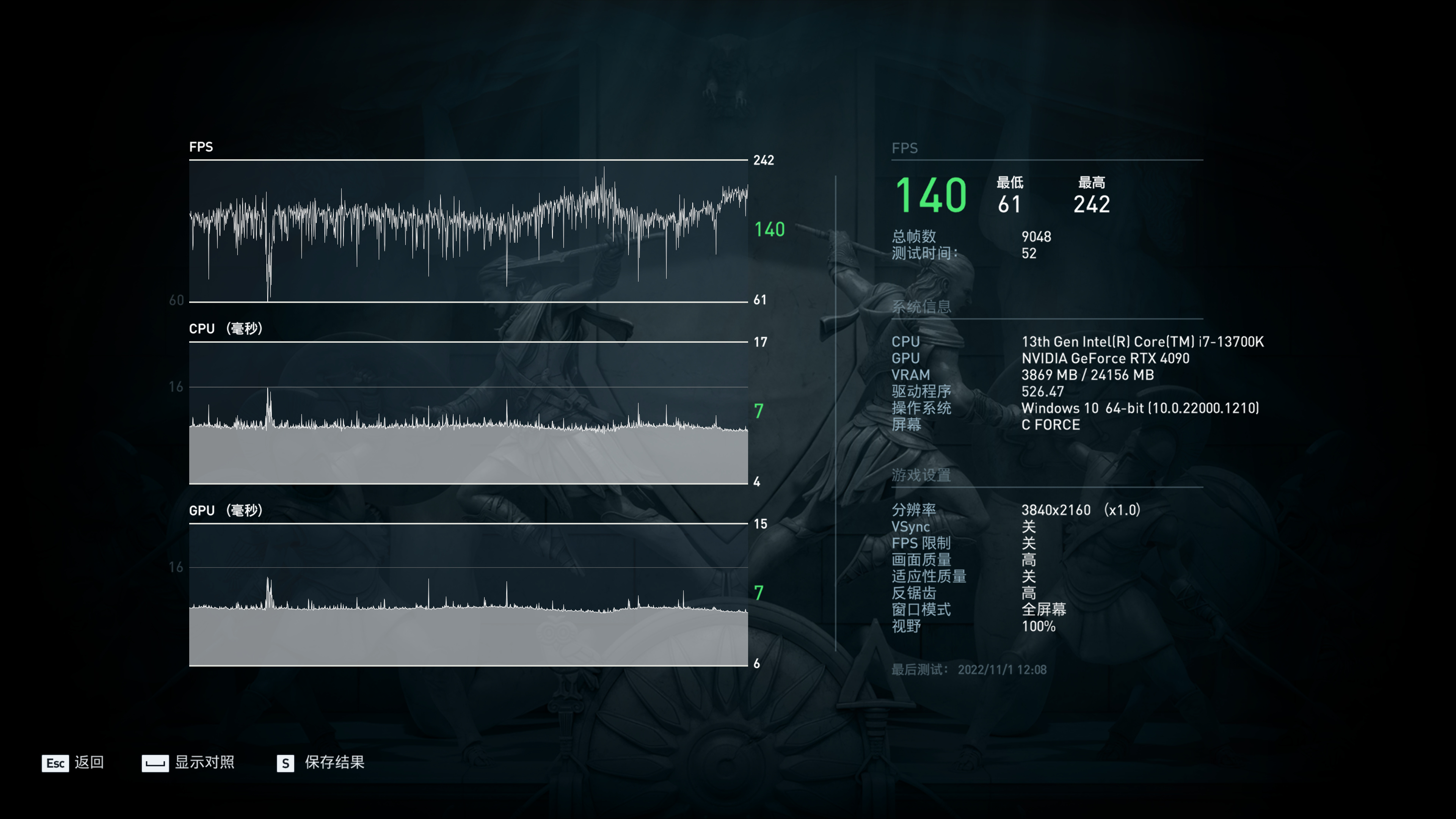「ASSASSIN’S CREED ODYSSEY」游戏内benchmark测试4K 画质平均帧数140帧 ,最低帧数61帧;