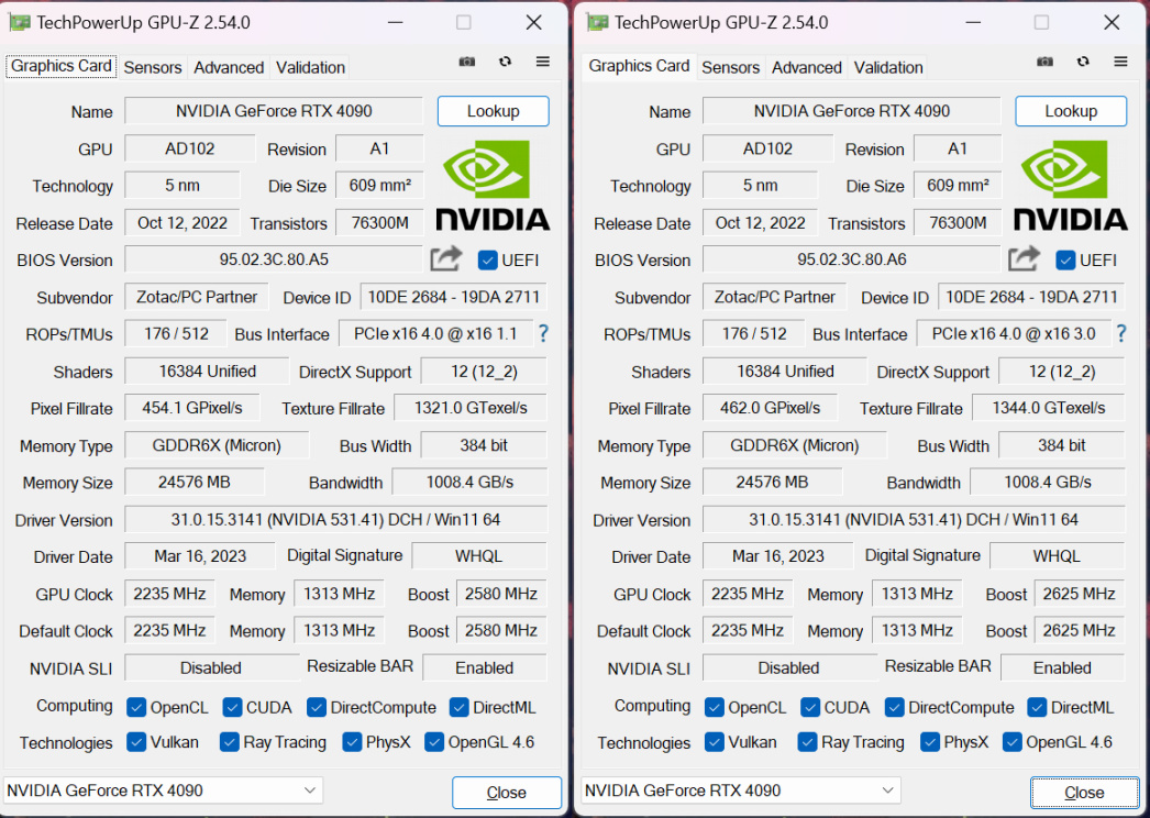 索泰 RTX 4090 PGF OC 显卡配置了双Bios设计,支持一键切换(需重启)。通过GPU-Z可以看到默认2580MHz,另外还有一个2625MHz 的高频版本可选。