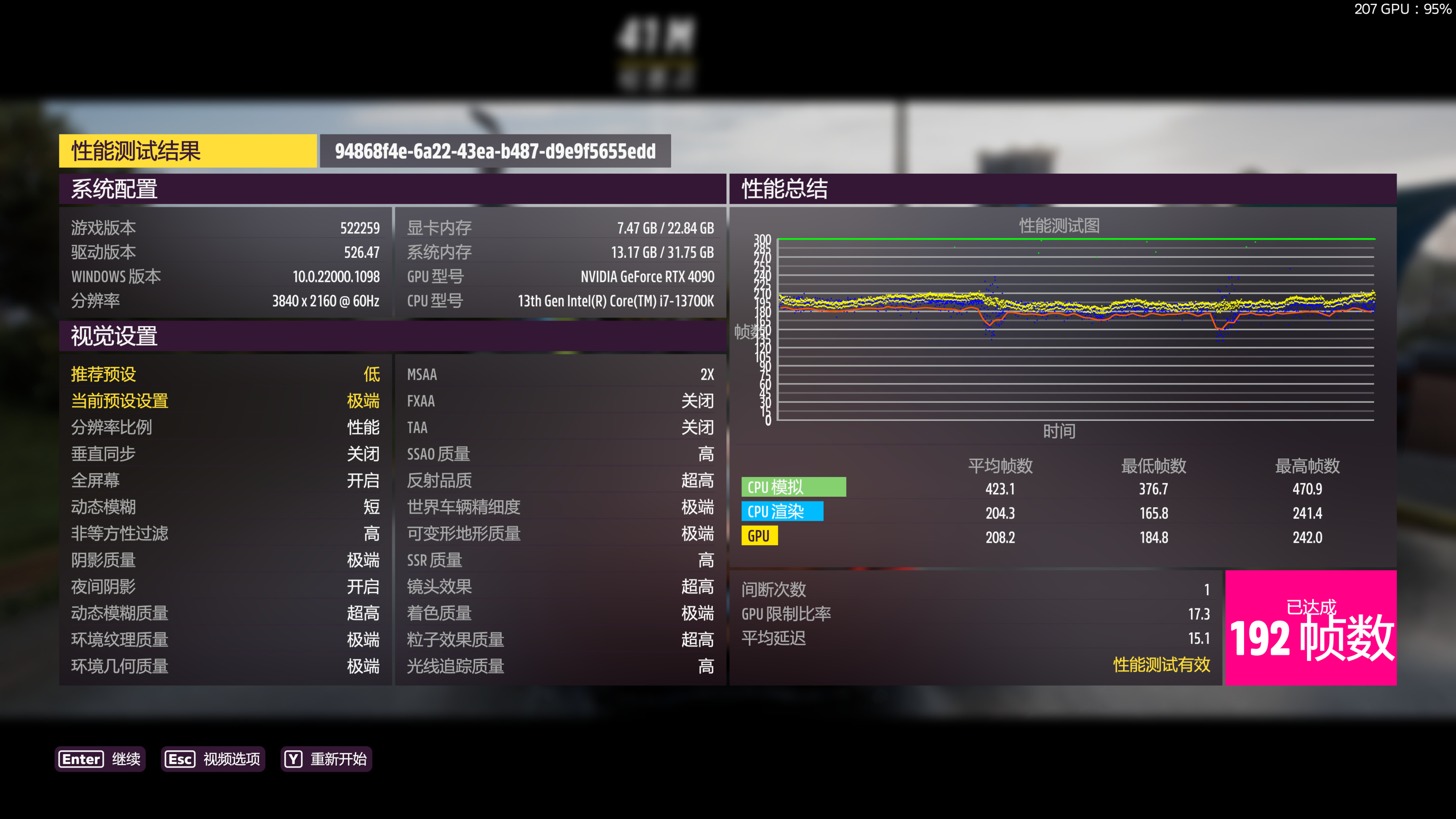 「FORZA HORIZON 5」游戏内benchmark测试 4K 画质 开启DLSS 功能后平均帧数192 帧 ;