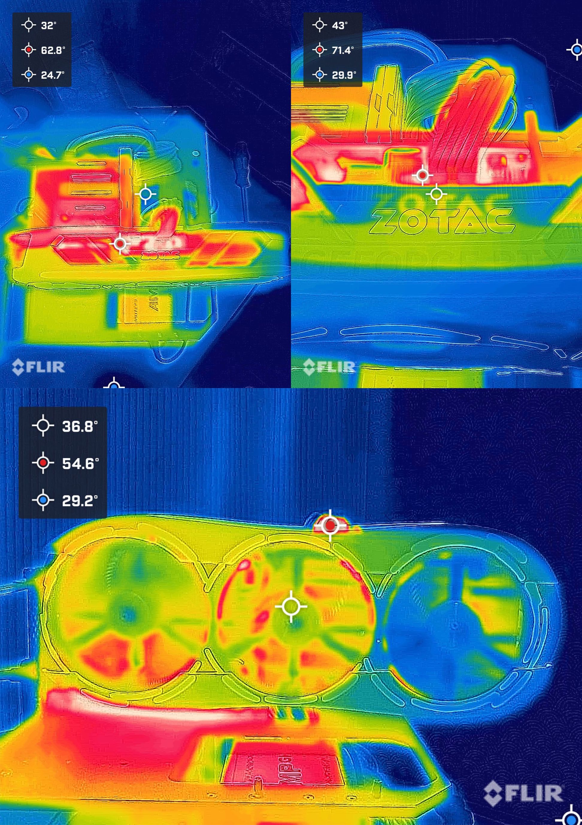 显卡发热情况可以参考压力测试时的温度红外成像图,从测试表现看冰芯VC 散热系统表现还是不错。而且三把11cm盾鳞仿生风扇也足够静音,平时在不少悠闲游戏时下观察风扇基本都是不转的。不用担心噪音问题。