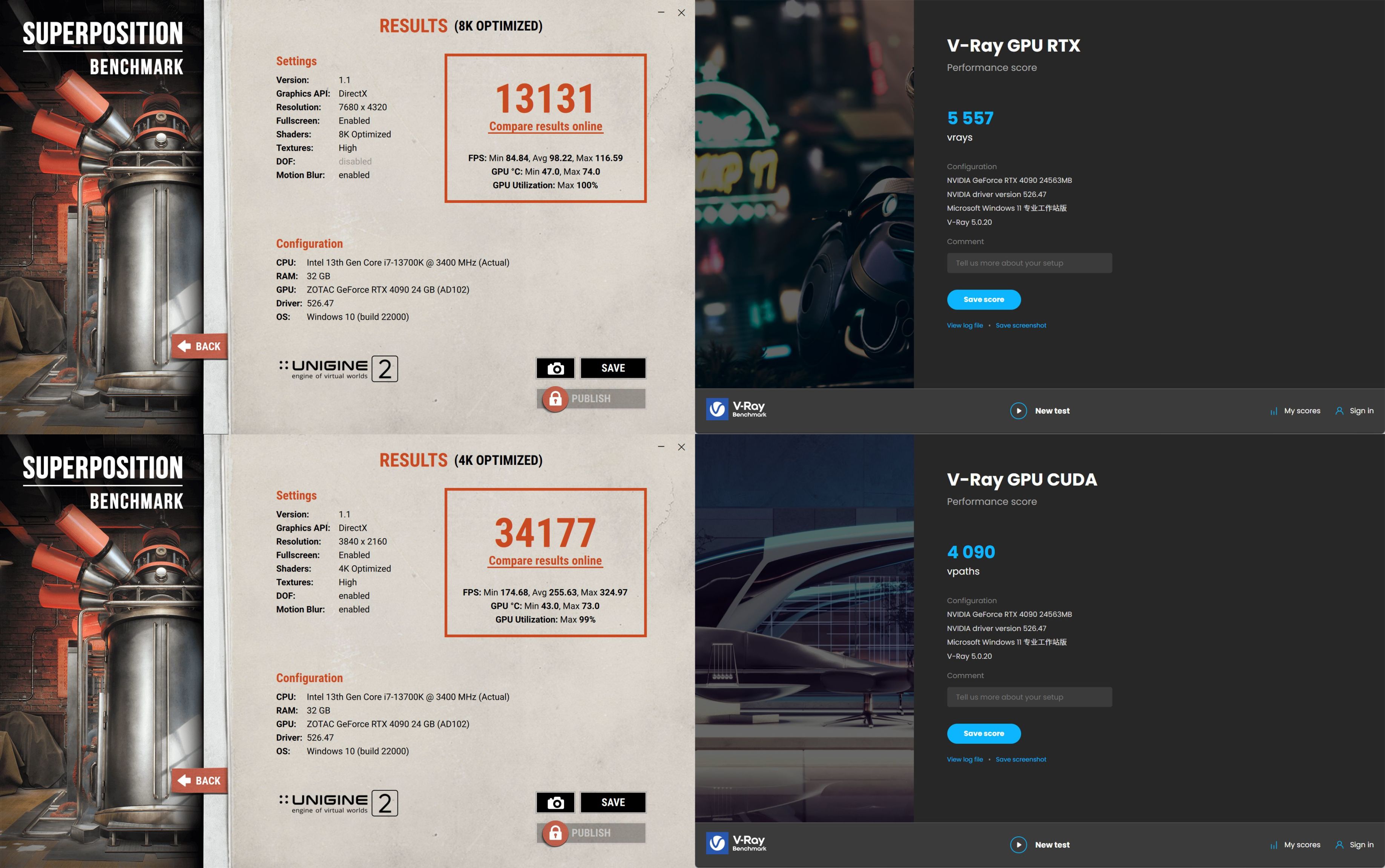 Superposition和Vray 显卡渲染测试,Superposition 4K 测试最高设置下 RTX 4090 PGF OC 显卡成绩也达到了3.4W 分,8K 成绩也达到了1.3W 分。Vray GPU RTX 测试成绩5557 ,GPU CUDA 成绩 4090 。