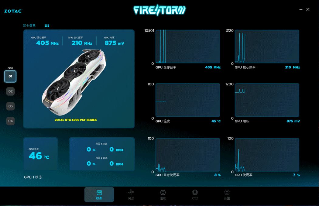 之前熟悉的索泰FireStorm 软件也来到4.0版本,可以说变化还是蛮大的。操作界面设置思路更清晰,首先是状态监控、风扇设置、性能监测、灯光与设置五个功能,可以监控显卡实时状态、参数信息、驱动与Bios 版本等。灯光自定义功能也可以实现对于显卡灯光的设置实现灯光同步。