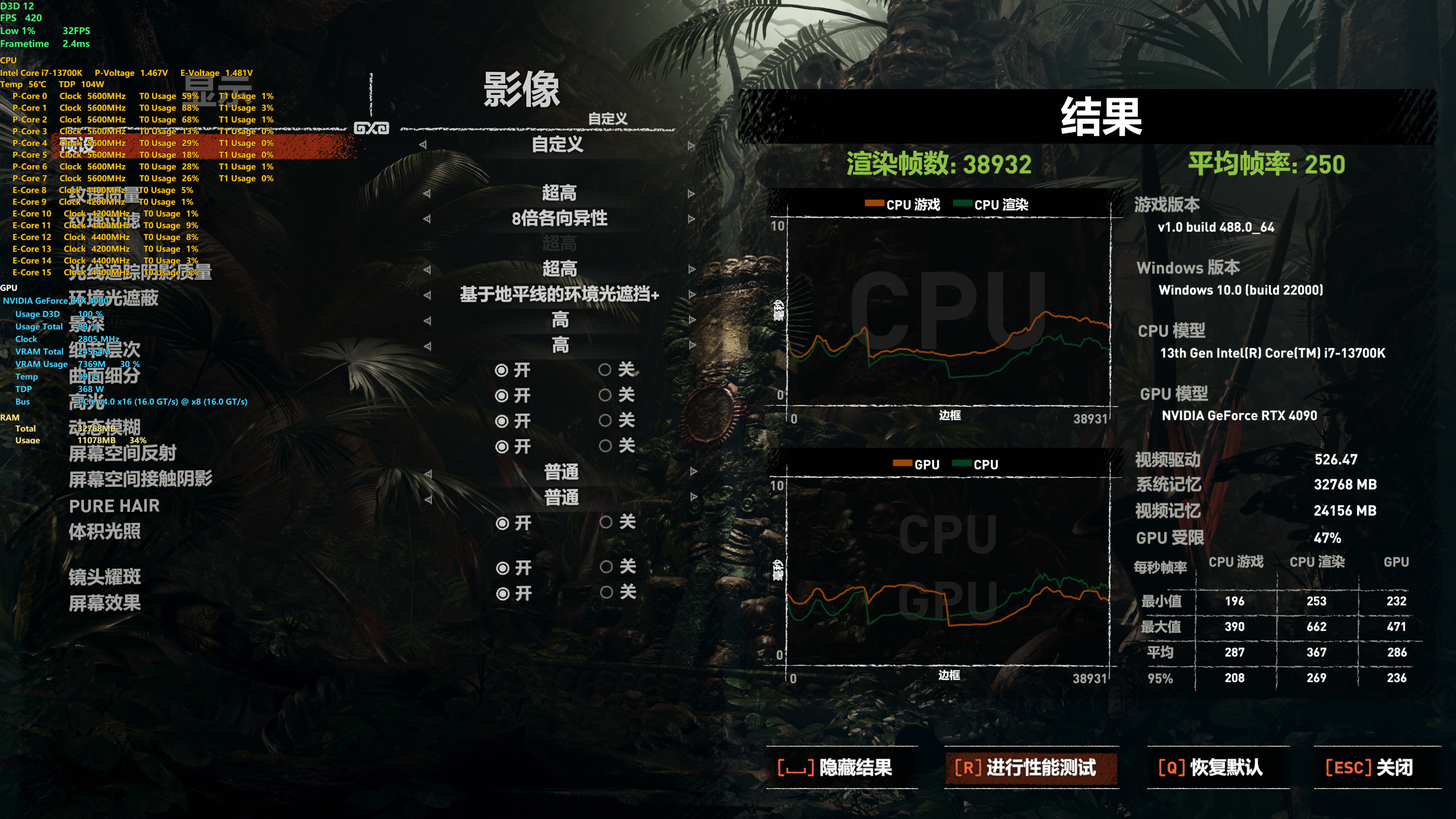 「Shadow of the Tomb Raider」游戏内 benchmark 测试 4K 画质 开启光追超级+DLSS 功能后平均帧数250 帧;