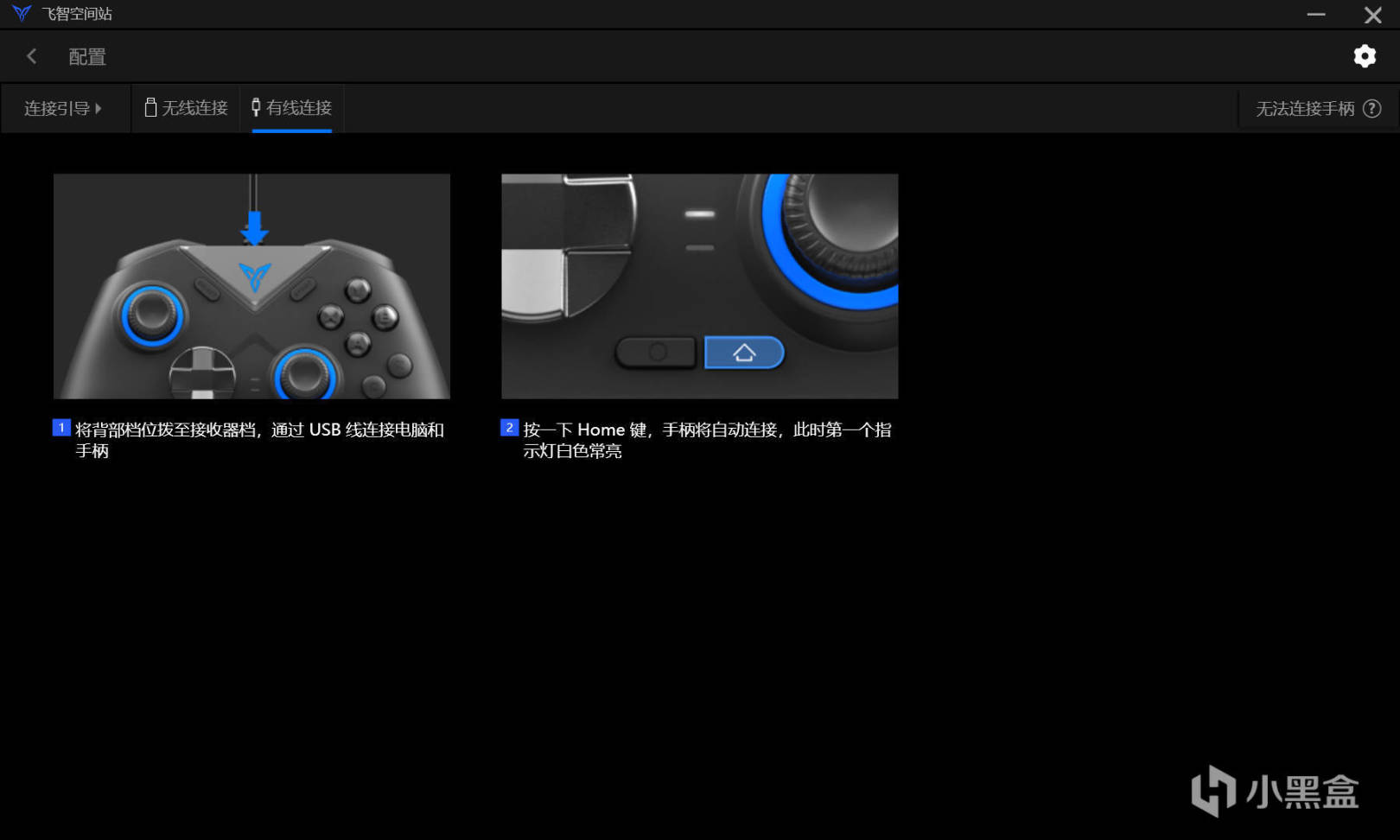 打开手柄插上线死活连不上电脑,然后看着说明书尝试了半天发现还是不行,然后下载了飞智空间站3.0,发现只用按下home键即可,强烈建议简化一下说明书。