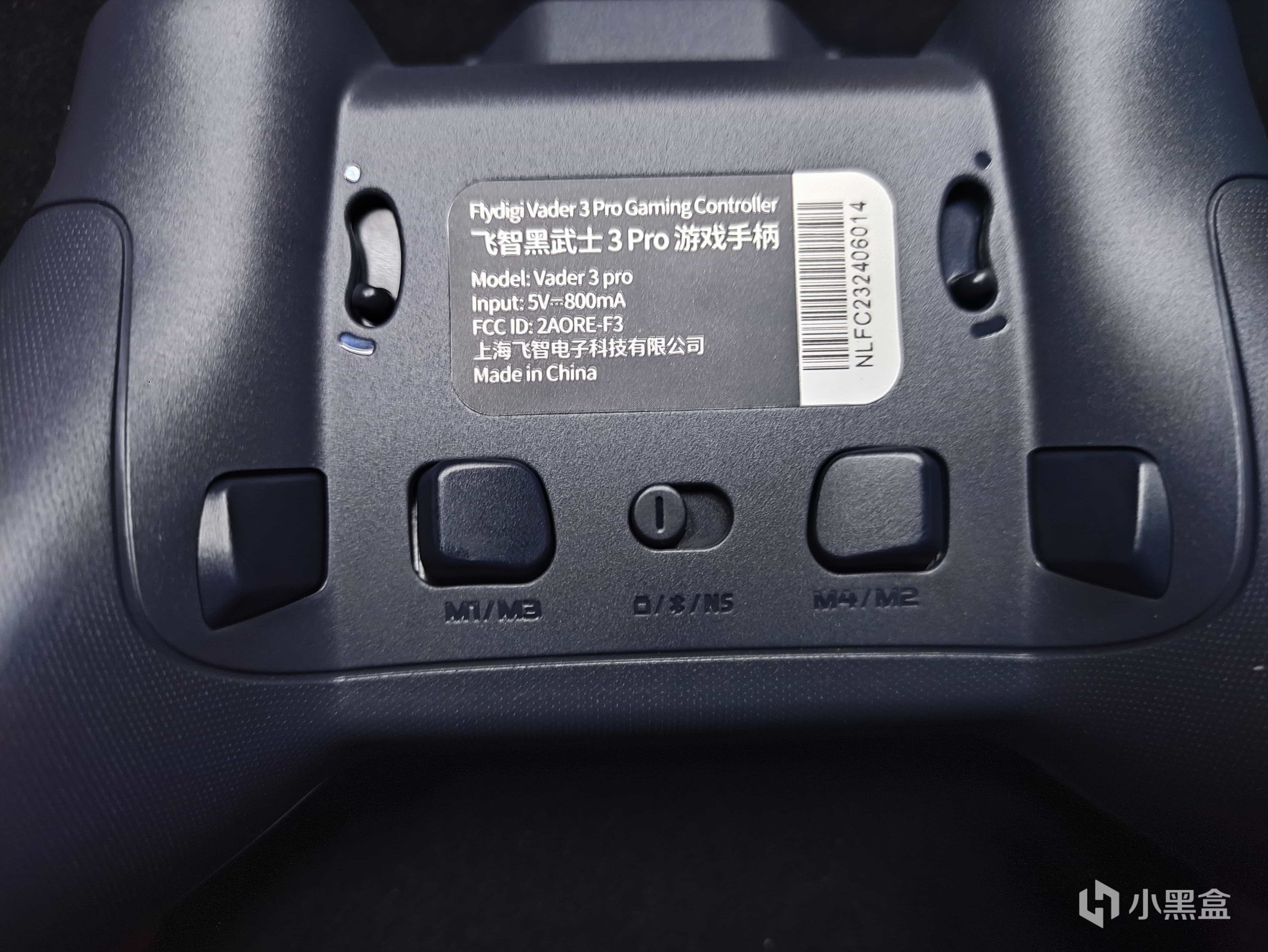 来到手柄的背面,可以看到四个背键以及中间的切换连接方式的连接方式的开关。
