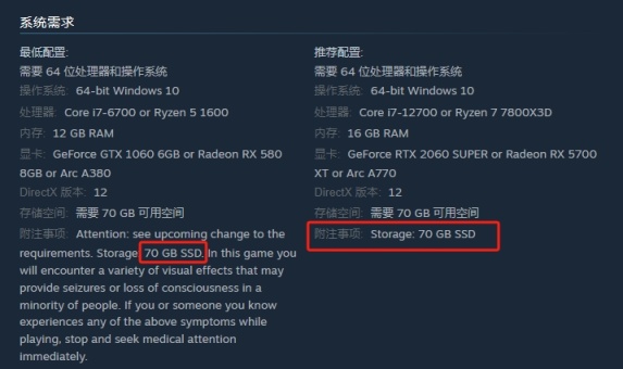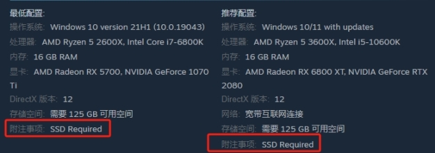 而现在《赛博朋克 2077》2.0 和资料片“往日之影”中,开发商也在附注事项中明确表示,游戏需要使用 SSD: