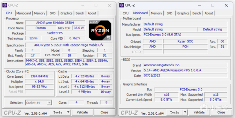 处理器的Tray产品ID为:YM3500C4T4MFG,也就是AMD Ryzen 5 3550H。该处理器为12nm工艺,4核8线程,基准频率2.1GHz,最大睿频频率单核可达3.7GHz,TDP为35W。
