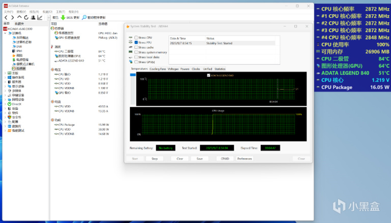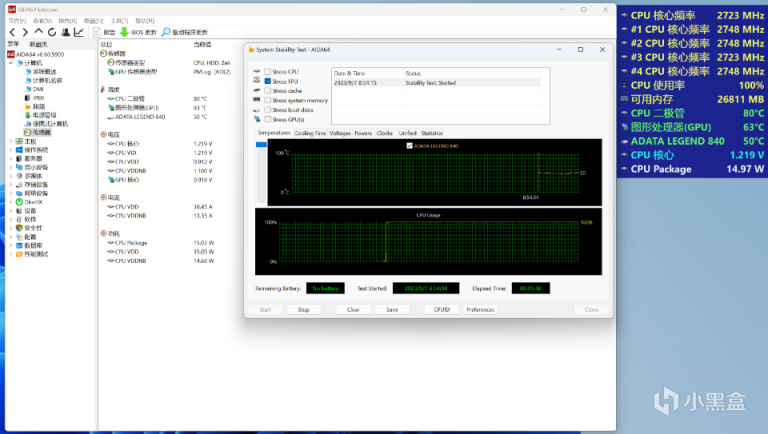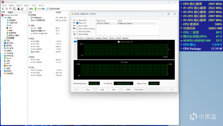 通过AIDA64单烤FPU测试,这台小主机3550H处理器温度樯应该是设置在80℃,开始还能保持全核3.0GHz,CPU核心电压为1.219V,功耗为17.19W。