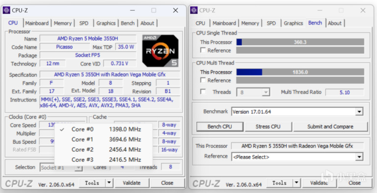 先来看看CPU-Z测试,单核360.3分,多核1836分,从主频来看确实能达到3.7GHz。