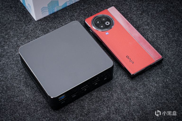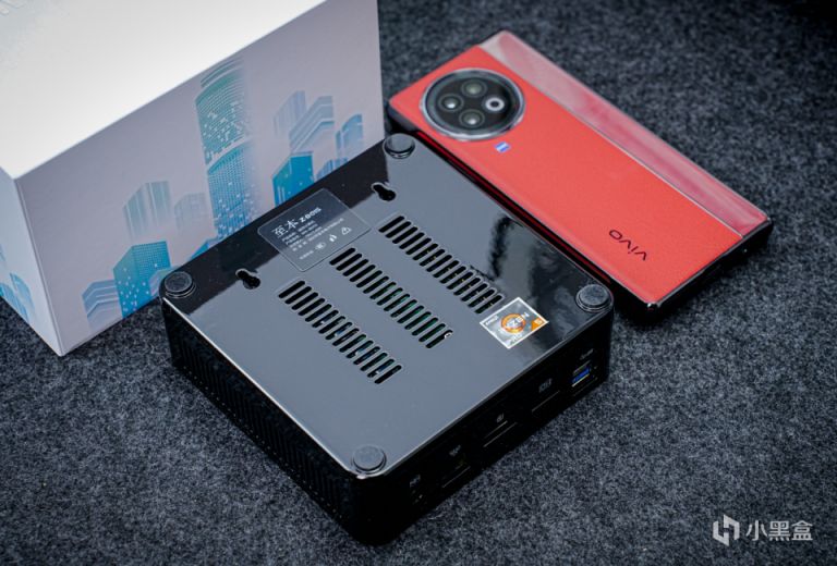 至本R5-3550H迷你主机的具体三维尺寸差不多是12.9x12.8x4.2CM,对比vivo手机就可以看到体型是真的小巧;至于重量大概在400g出头(不包括内存与固态)