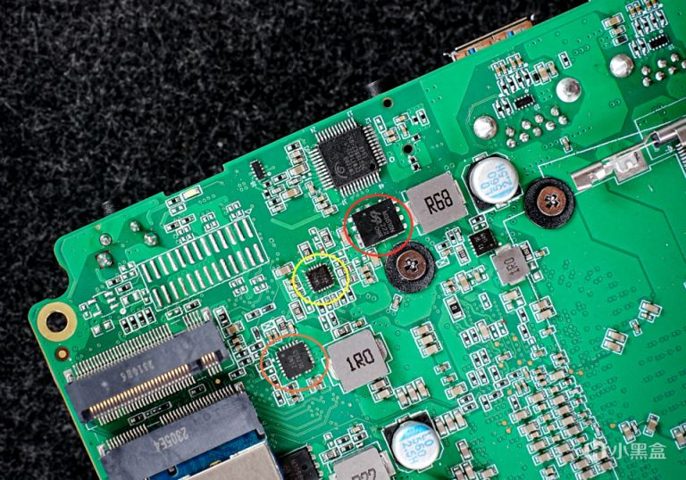 黄圈中是gstek7271 DC TO DC芯片,橙圈中是GSTEK GS9230 PWM芯片,红圈则是核显供电的MOS管,型号为UBIQ力祥半导体的M3816N。此外周边还有很多电感和铝壳电容。