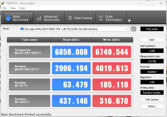 ▲在另一款软件TxBENCH上进行测试,其数据变动不大,顺序读取速度约为6850MB/s,顺序写入速度约为6750MB/s,两个软件的测试逻辑肯定不完全一致,所以结果略有不同实属正常。