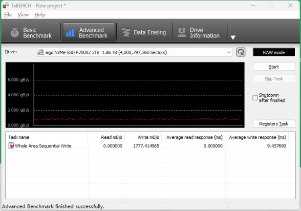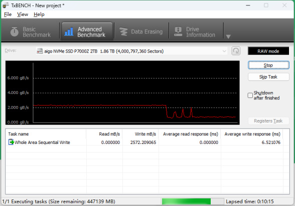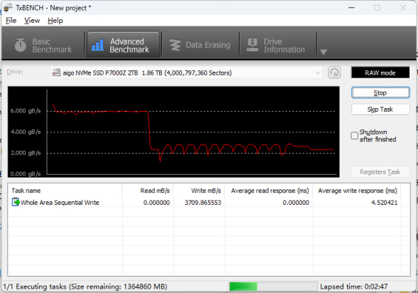 为了实测aigo P7000Z 2TB版本的SLC缓存大小并测试其在超大文件连续写入时的表现,我们需要先将aigo P7000Z 2TB SSD的卷在系统中移除,然后以TxBENCH 对其进行一次raw文件全盘写入测试。