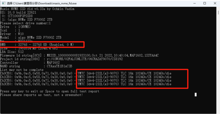 ▲通过maxio版的flash_id软件进行测试,我们可以得知这款固态的颗粒正式来自YMTC(即大名鼎鼎的长江存储)的第四代3D TLC颗粒。