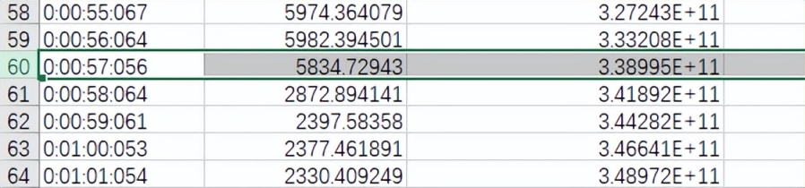 ▲我们先来看一看SLC缓存的大小,在测试开始后,aigo P7000Z 2TB版本的持续写入速度一直稳定在6000MB/s左右直至第57秒,此时总写入数据为338994659328字节,折合315GB。由此可知aigo P7000Z 2TB版本划分了约六分之一的空间为SLC缓存。