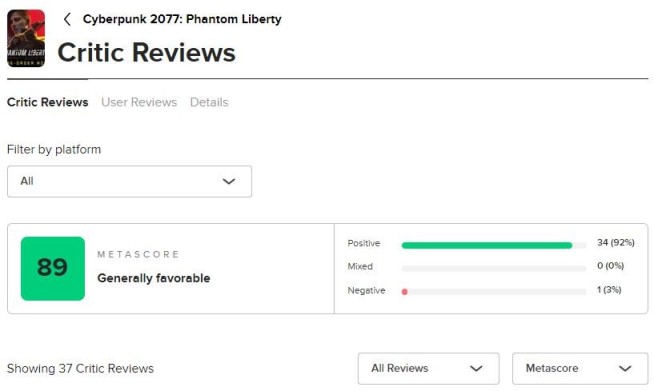 《賽博朋克2077》的重量級擴展包“往日之影”媒體評分現已解禁,知名評分彙總網站Metacritic現已收錄了約37家左右的媒體評分,目前均分爲89(全平臺)。