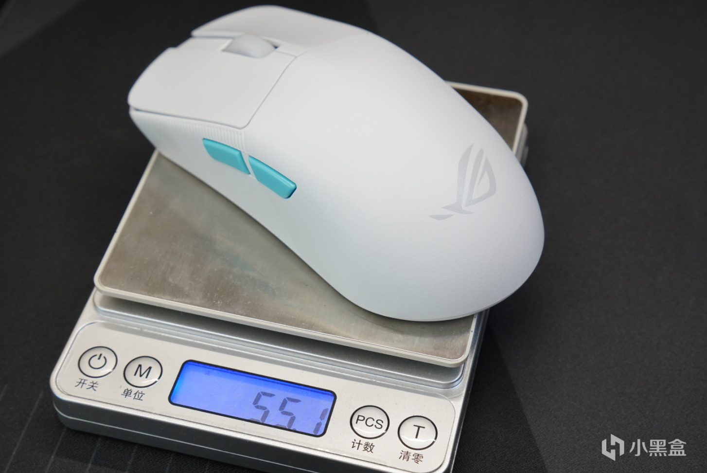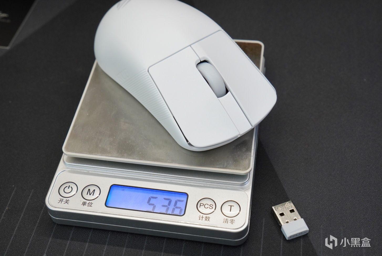 鼠標重量方面,鼠標帶接收器的情況下55g不帶接收器的情況下是53.6g,真的屬於一個輕鼠了,ROG這一點做的很好,在鼠標本身是一個大鼠的前提下,之後給你做了一個輕量化的設計,對於我這種大手的人來說很好,真的很好。