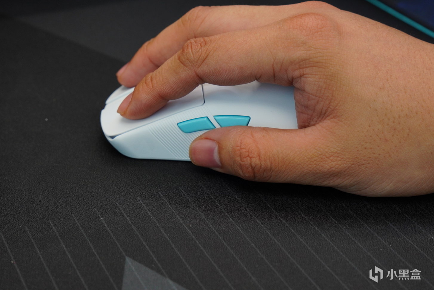 側鍵這部分也是啊下方略微收窄,可以使手指更好的接觸鼠標,抓握是很輕鬆的。