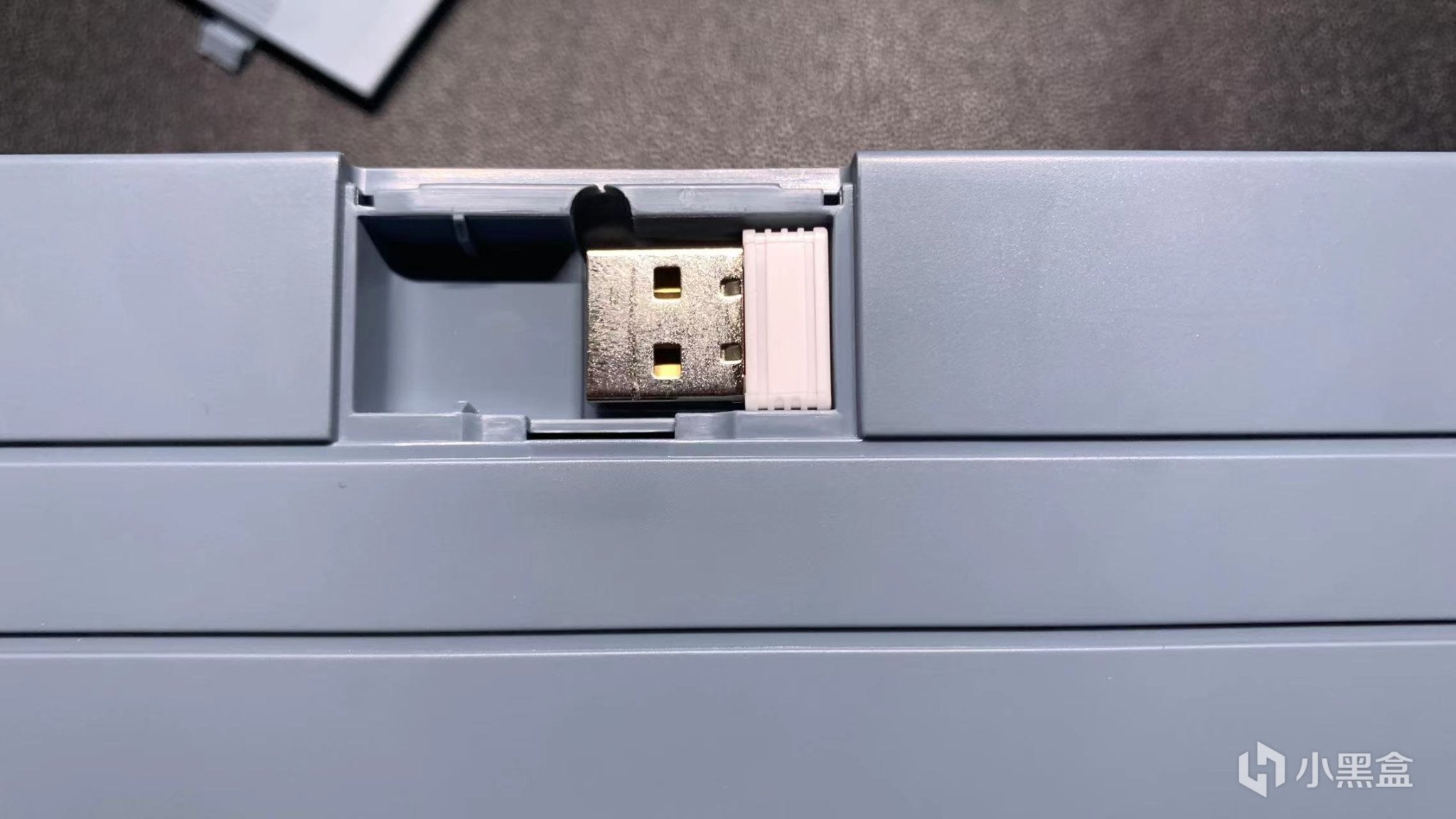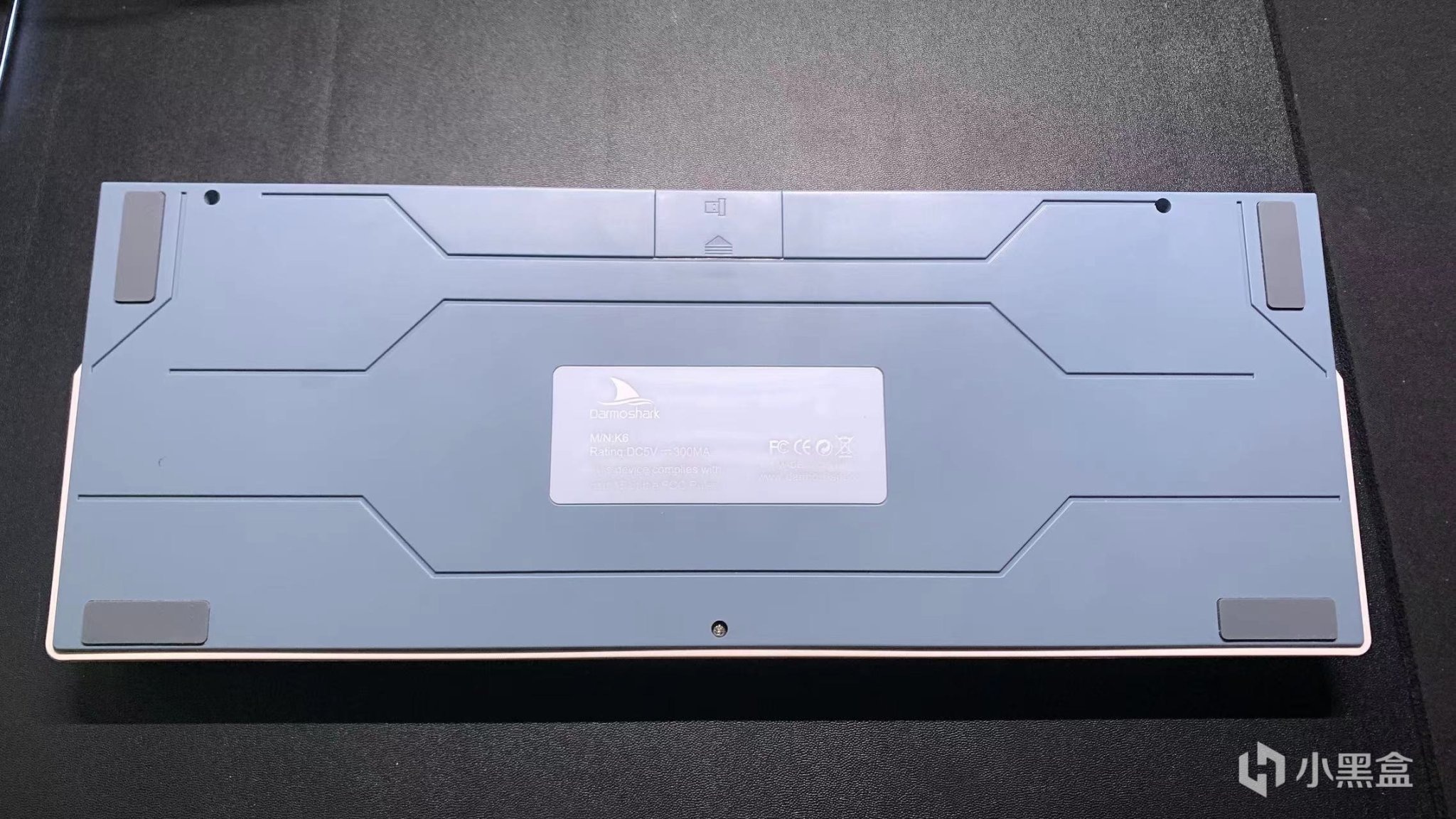 键盘的背面就是很整洁,没有过多的设计元素(正经人谁看键盘背面啊)就单纯的防滑脚贴四个以及一个2.4g收纳仓