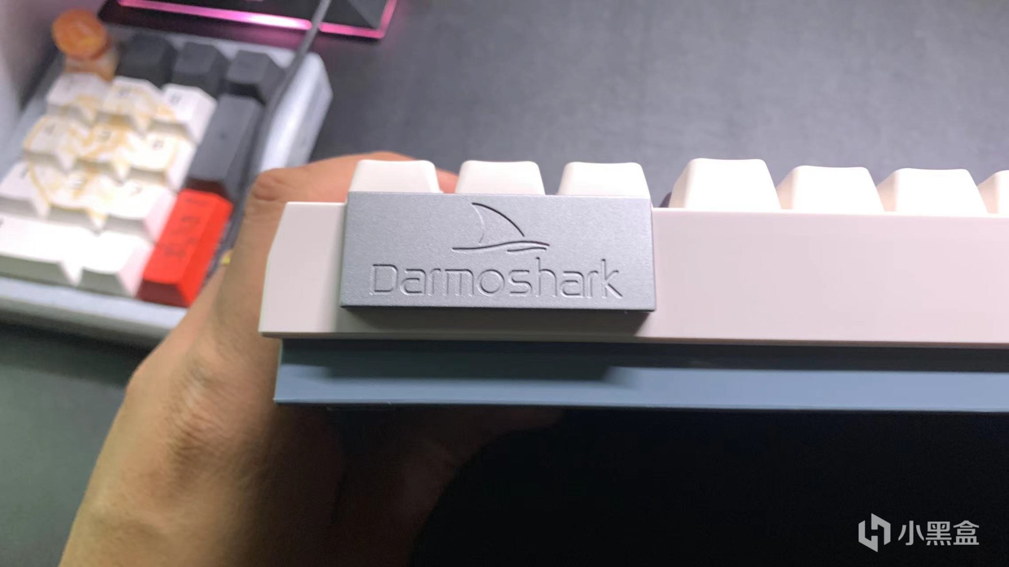 键盘的右上角有一块金属配重上面印着达摩鲨的品牌名字以及品牌logo,质感不错,同时也增加了键盘整体的一个重量。