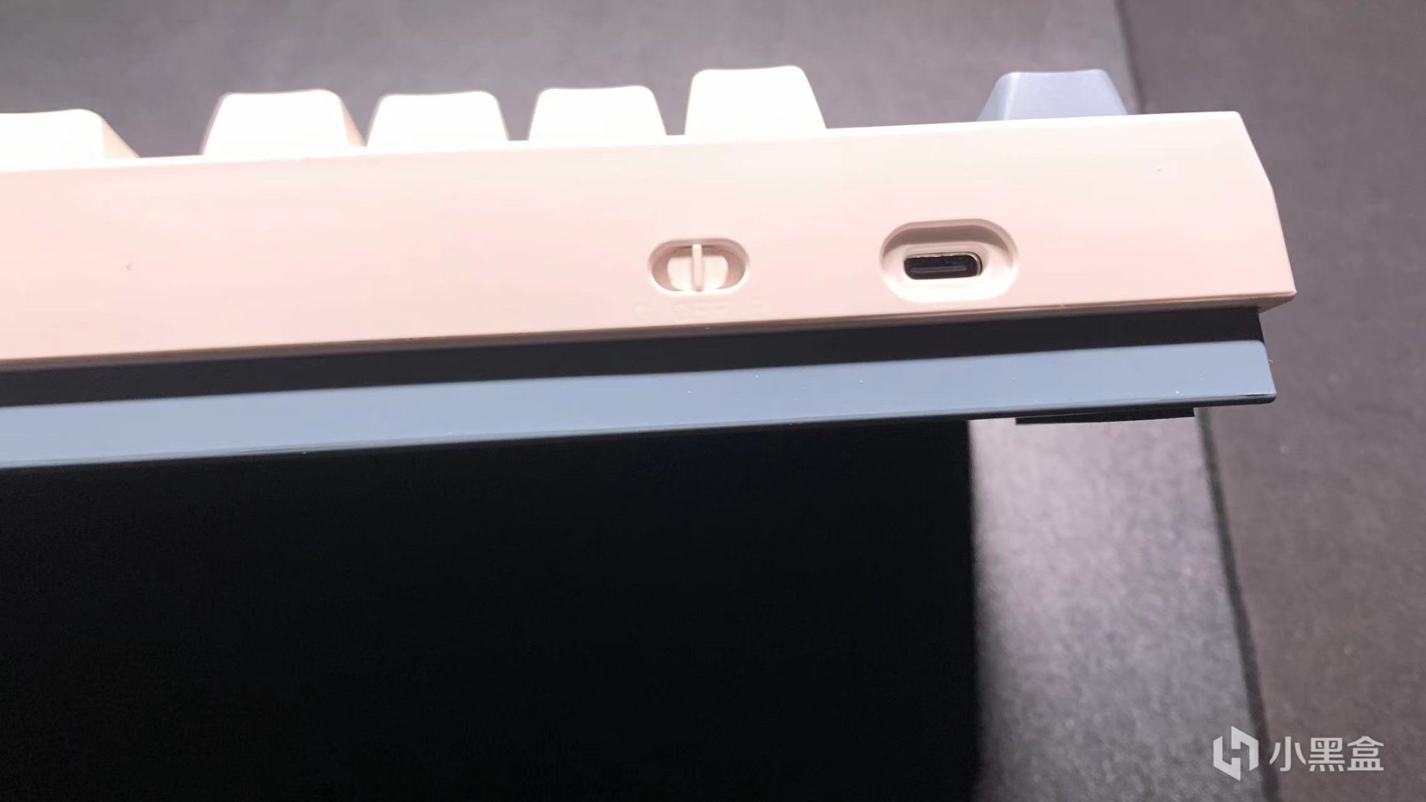键盘的模式切换开关以及充点口位于键盘的左侧,但是这里我想说一下啊,就是这个模式切换的标志实在是太不明显了,我拍照都拍不出来,如果可以的话希望改一下吧。