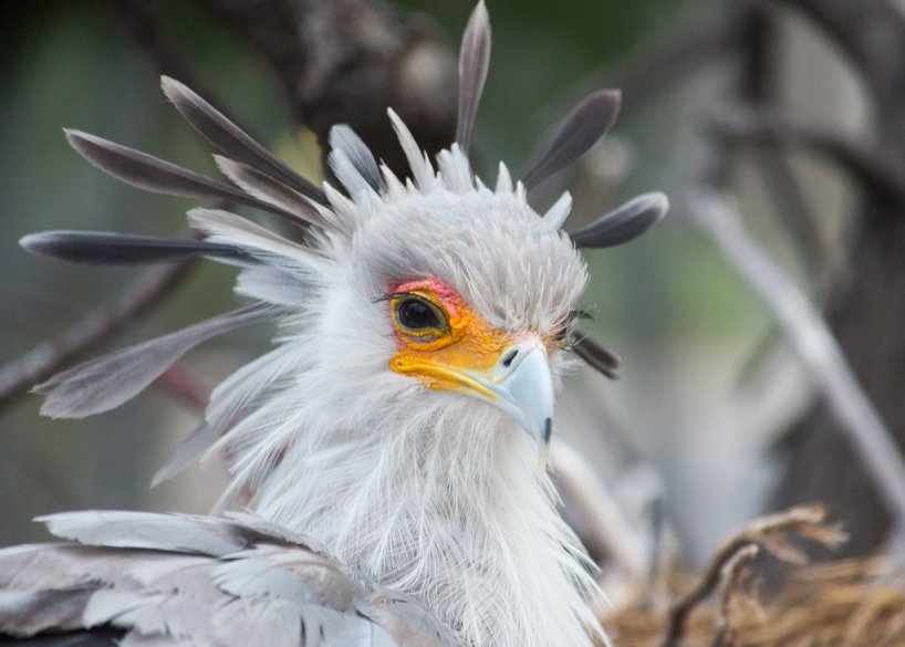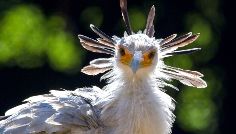 外貌奇特,头钩喙似鹰,长腿似鹤,头顶羽冠,有20根黑色冠羽。羽冠在平时如发辫般低垂,而当被激怒或者紧张时会高高竖起。