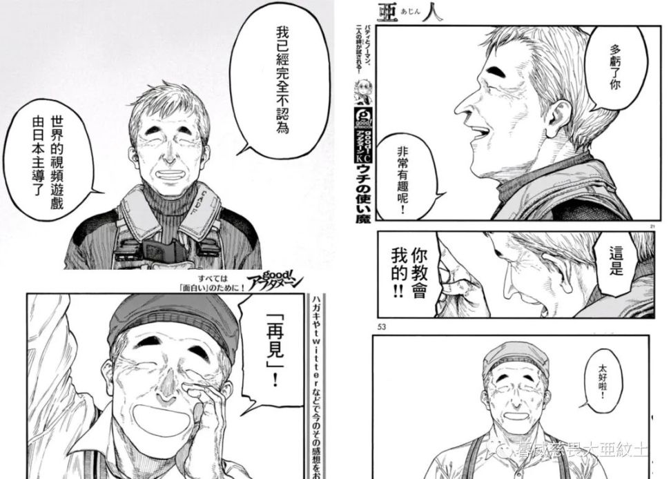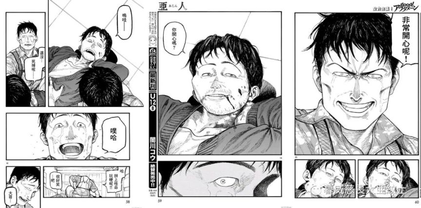 佐藤会成为亚人一时间我不知道该如何评价是好,佐藤的表情自始至终都超级平淡,大笑,浅笑,阴险的笑以及小小的惊讶,甚至作为普通人类在被枪毙之前嘴角都挂着微笑,说出来的话也不是咒骂和仇恨,不如说除了演戏以外他好像就没有谴责过其他任何人,整篇看下来他就是一个超级平和的大叔,这种人的心里会有剧烈的感情?
