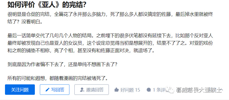 但是代入作者的角度想一想,在当时的世界观我该如何画一个比单枪匹马屠杀一支军队,以及驾驶客机还震撼的结局呢?是靠核爆解决佐藤吗,亚人并不能用核爆解决再说日本也没有这个条件,是靠男主的“洪流现象”暴走解决佐藤吗?那样和热血少年漫有啥区别,而且更俗套了,好像想来想去也没有办法制造出更震撼的结局