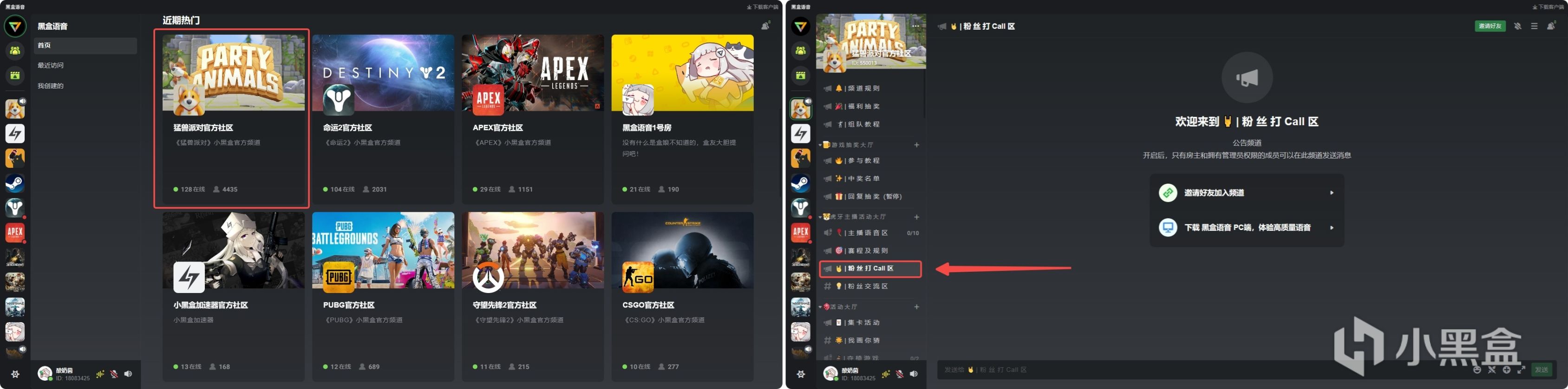 - 前往PC端黑盒语音https://chat.top,在首页找到「猛兽派对官方社区」,并前往左侧频道【粉丝打Call区】为你喜欢的主播助力(回复表情)即可参与抽奖;或复制邀请链接http://chat.top/iyx6ib,并前往PC端加入。