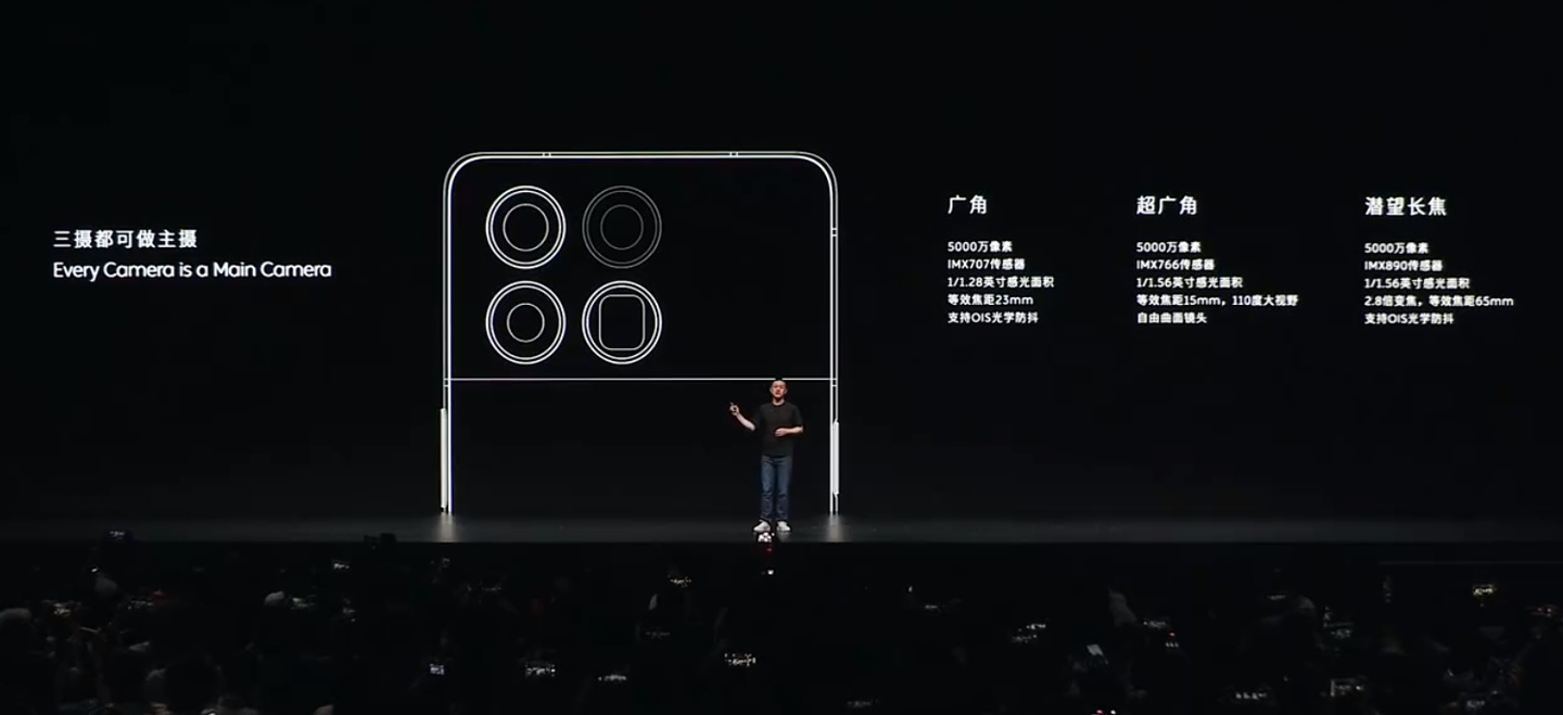 影像方面,蔚來 NIOPhone 搭載三主攝,分別爲 50MP 廣角 + 50MP 超廣角 + 50MP 潛望長焦,鏡頭模組排布採用了類棋盤設計。