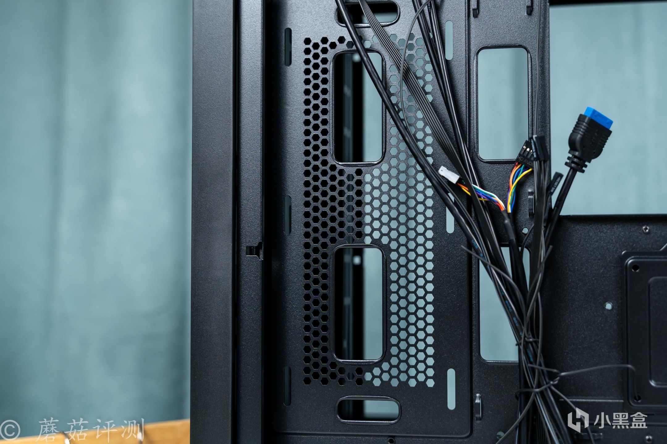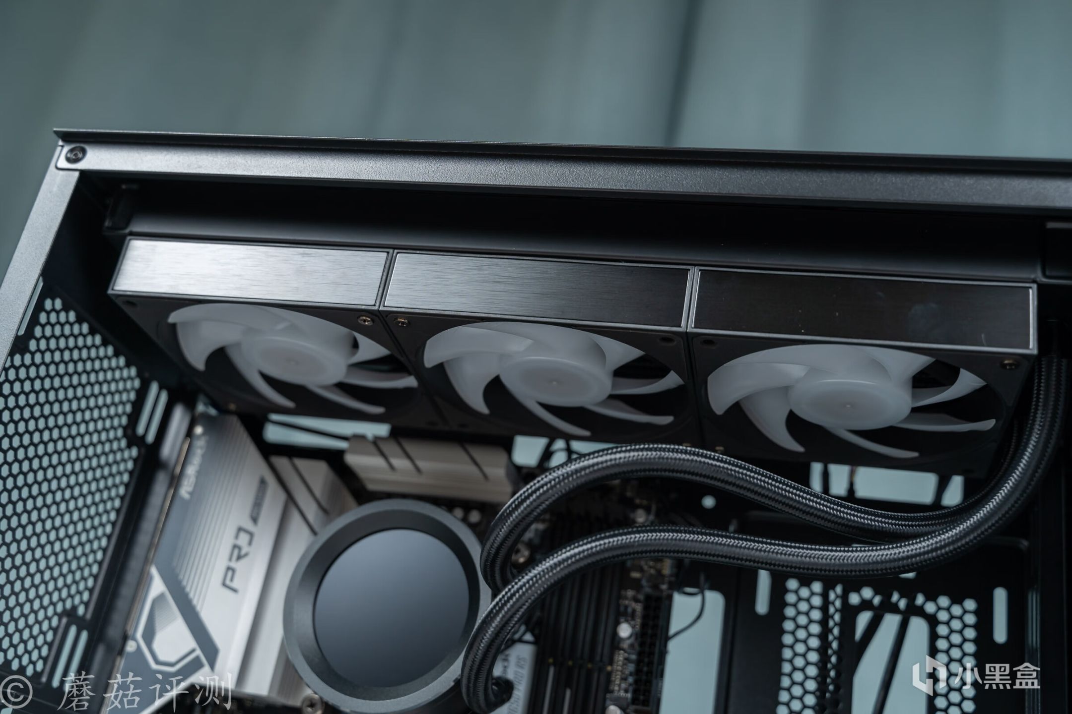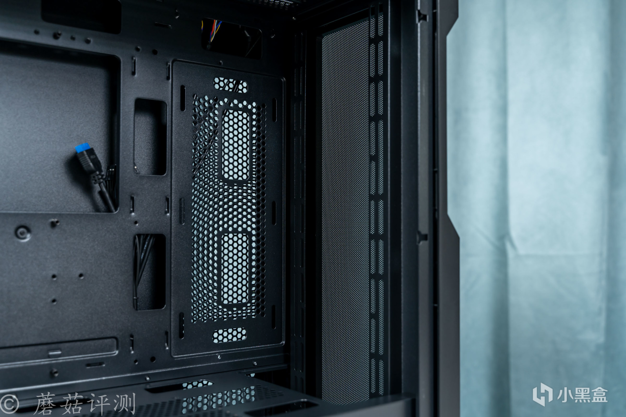 ▼机箱前部的内侧有从上到下的支架,用于安装机箱风扇和固定水冷排。