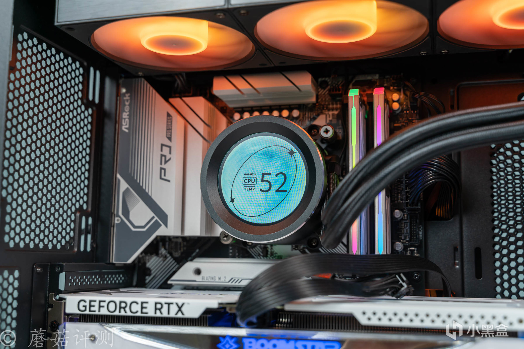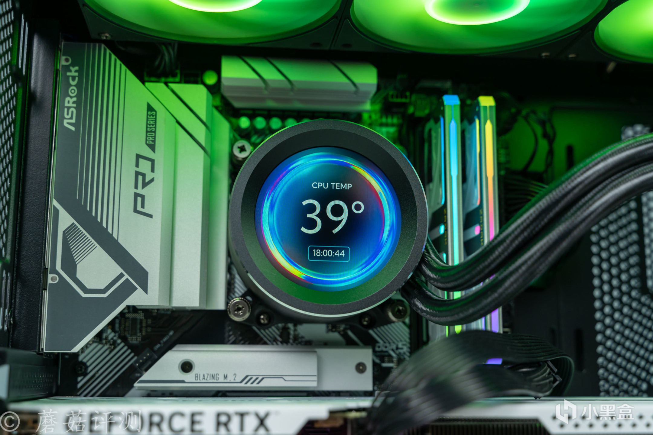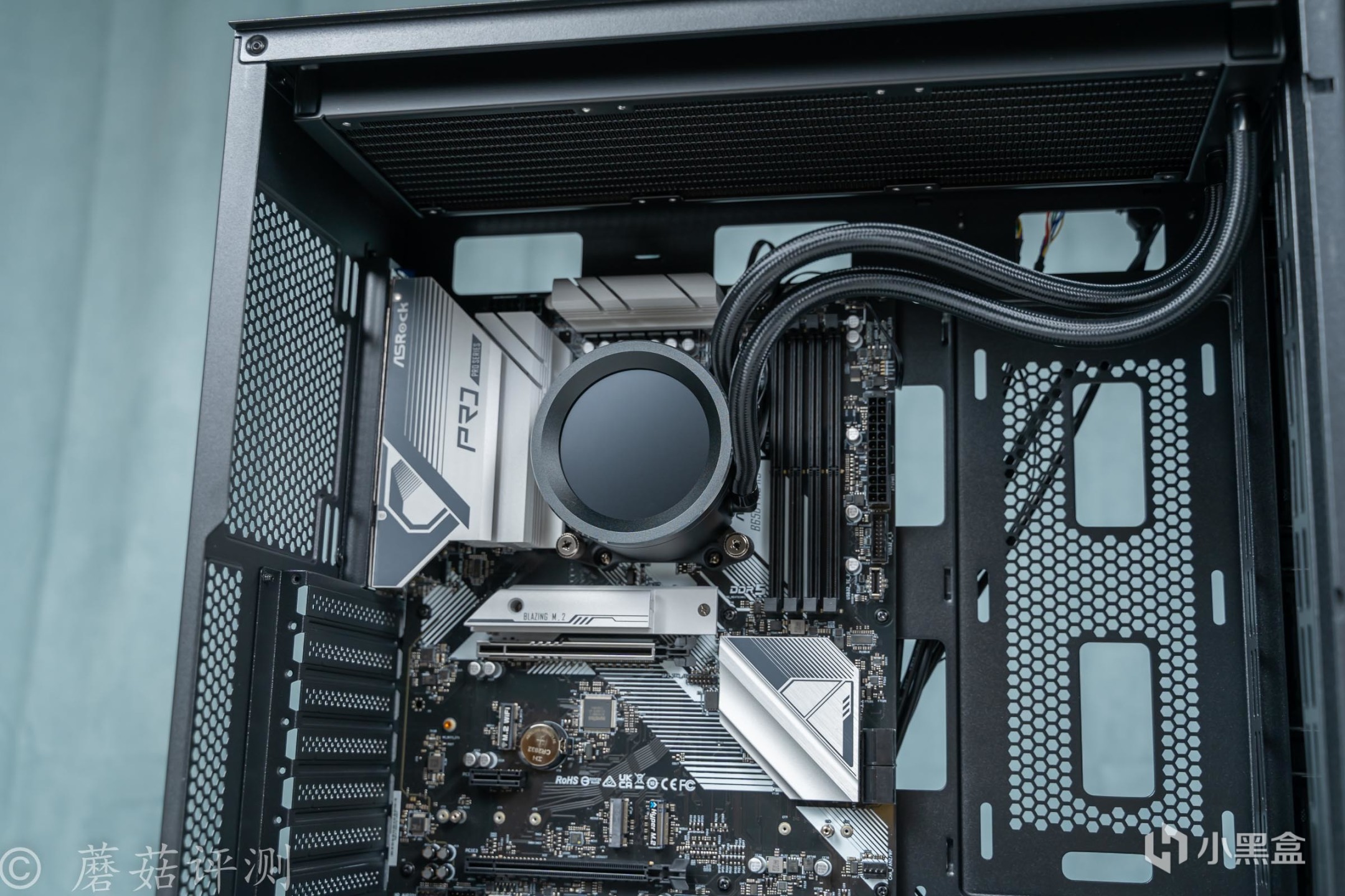 华擎B650 Pro RS主板也十分不错,供电部分有完整的金属件覆盖,这块主板的拓展性表现也足够出色,毕竟是ATX规格的。先马的这款XW360-P水冷非常棒,水冷头顶部标配了一块2.8英寸的超大尺寸的屏幕,视觉观感非常的震撼。并且,这款水冷的做工用料也十分出色,水冷头整体都是金属材质的,触感冰凉。