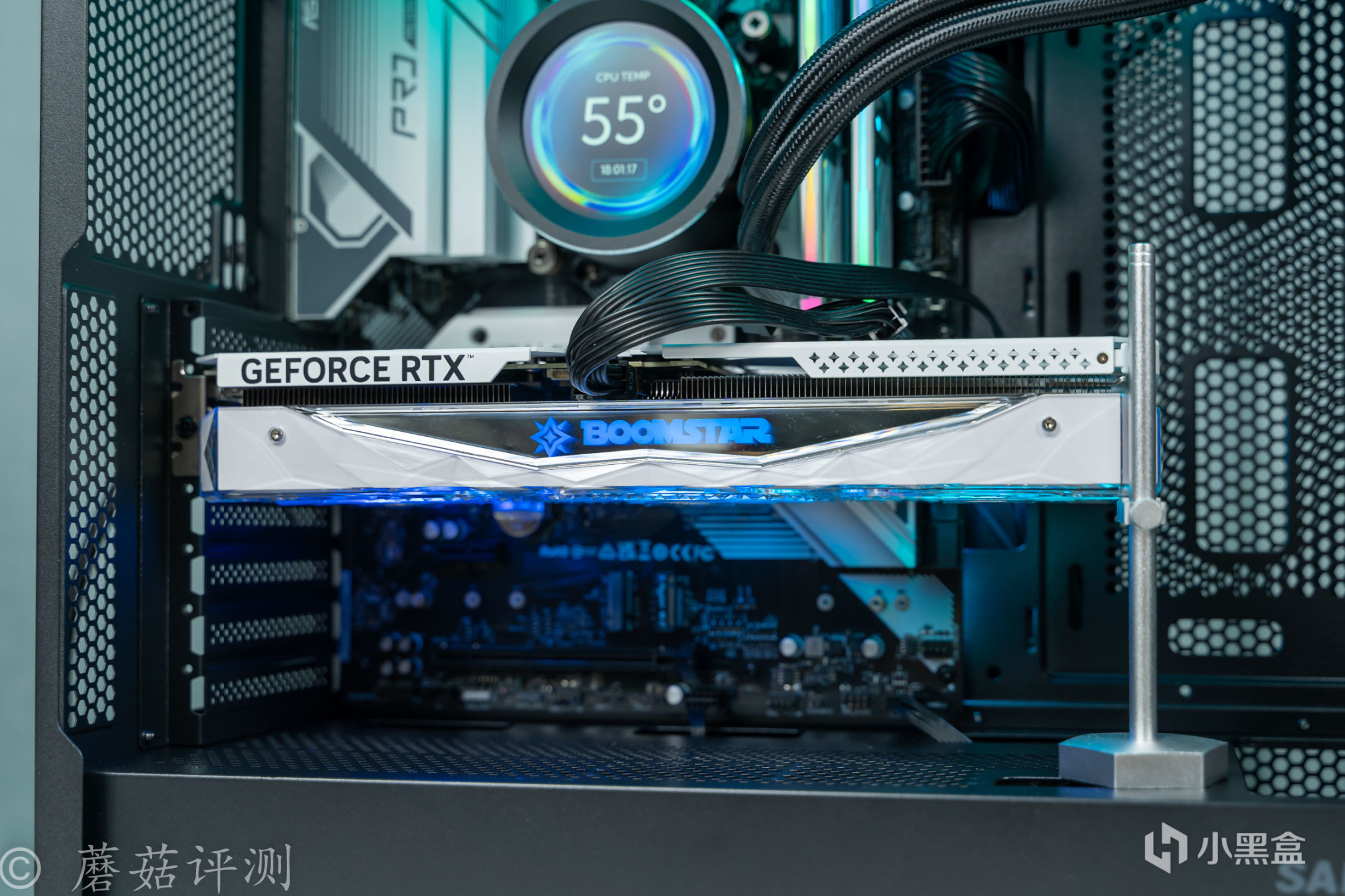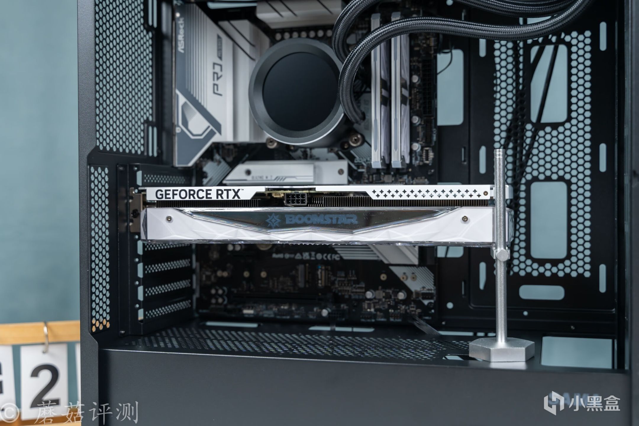 ▼显卡默认水平安装,并在显卡的尾部,撑上一个标配的金属显卡支架,让显卡整体保持水平。