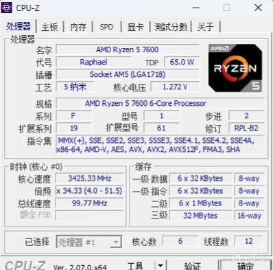 ▼AMD的R5 7600,采用5nm的工艺制程,6核心12线程,三级缓存32MB。