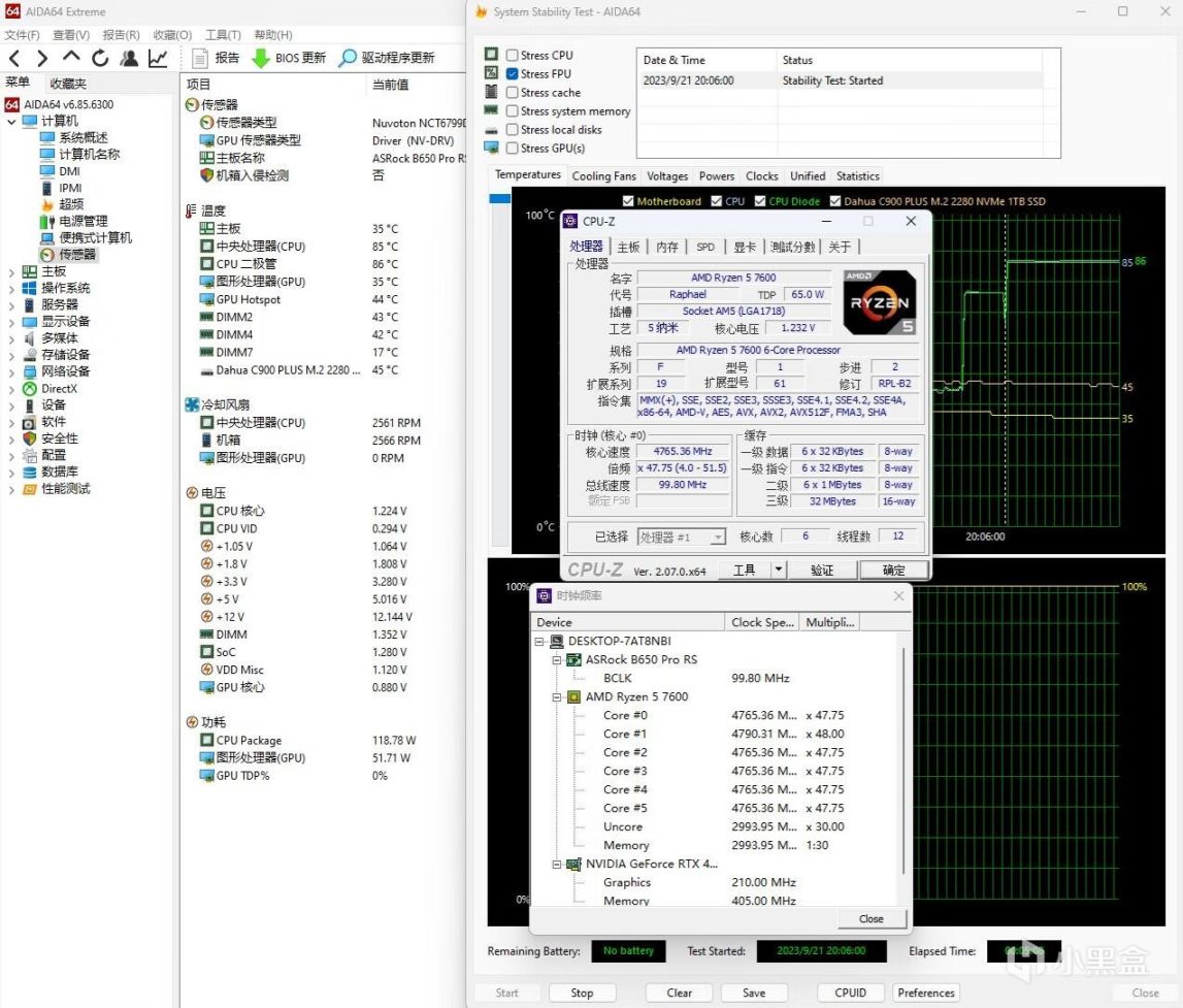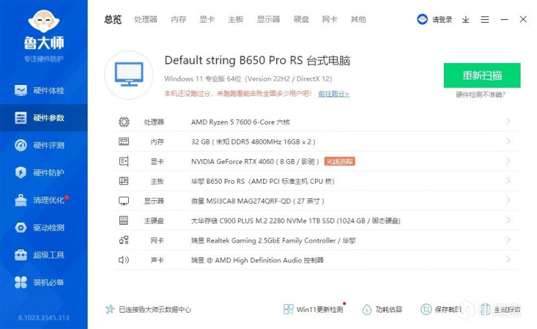 ▼整机配置一览,处理器是AMD R5 7600,主板是华擎的B650 Pro RS,显卡是影驰的RTX4060星耀OC。另外,在处理器的设置方面,简单的开启85℃的PBO,没有降压。