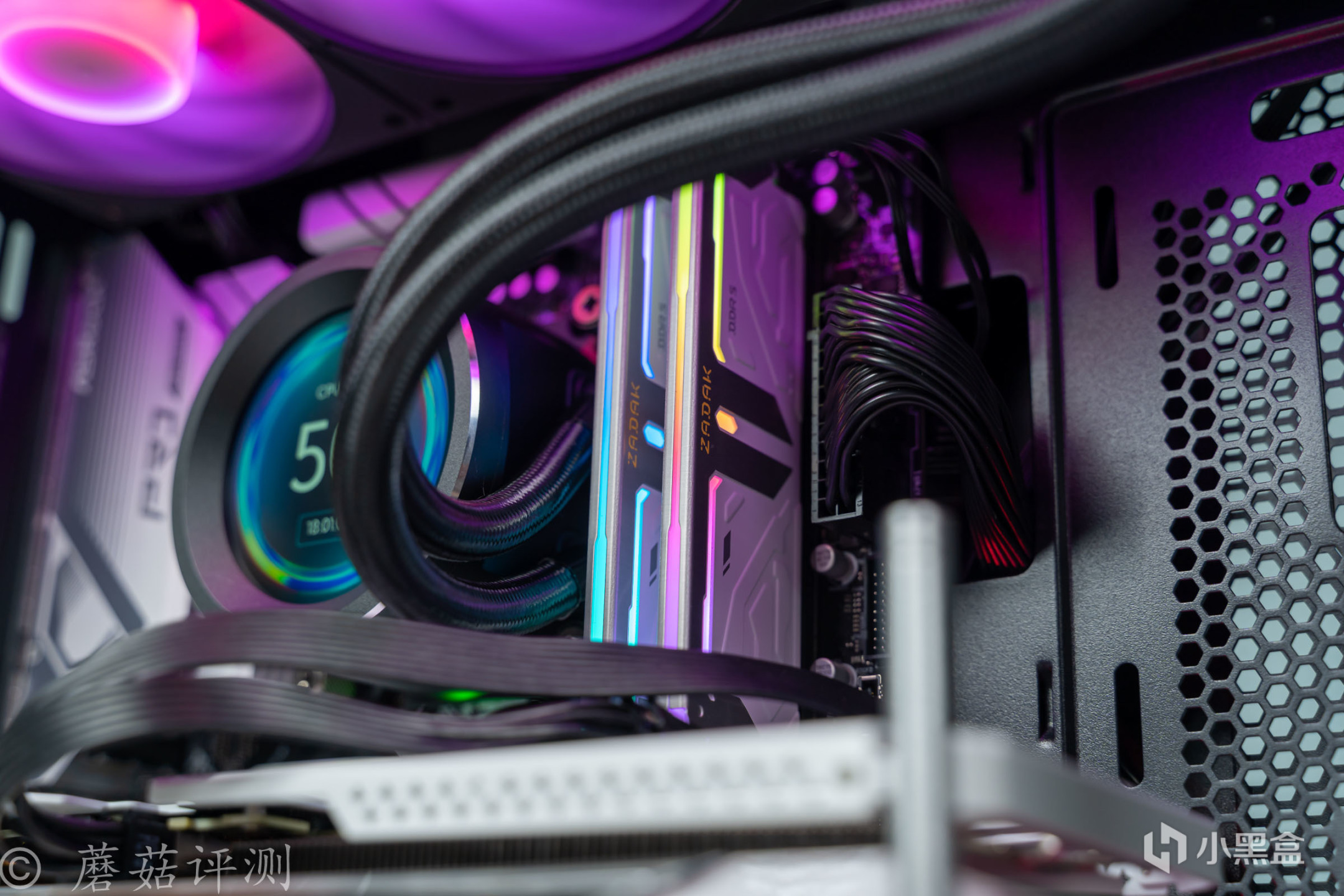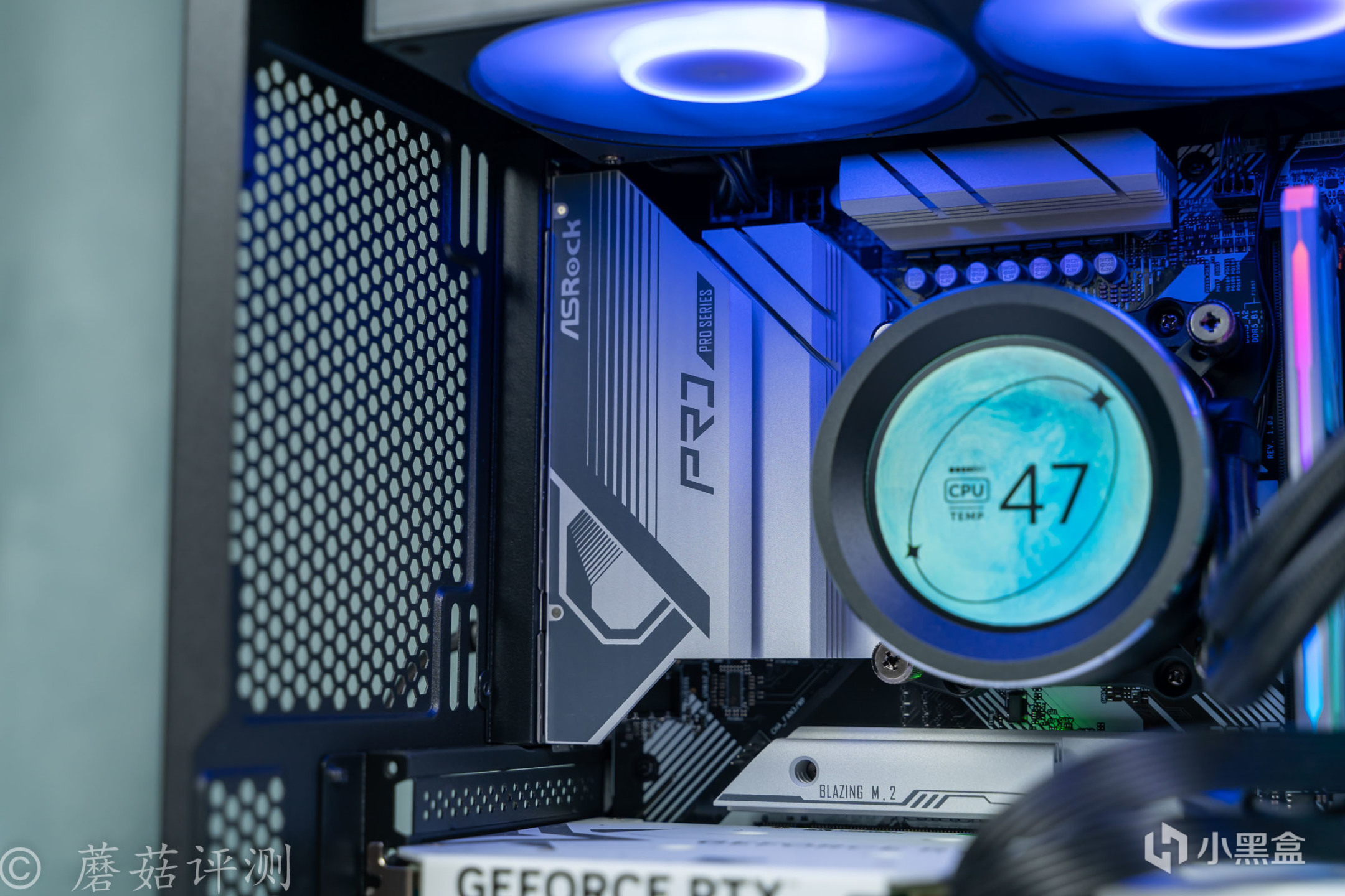 ▼机箱内部的颜值还是非常漂亮的,各种硬件都有漂亮的RGB灯效,搭配一起的效果也不错。机箱风道方面,就是上出风道,从机箱的侧面进风。