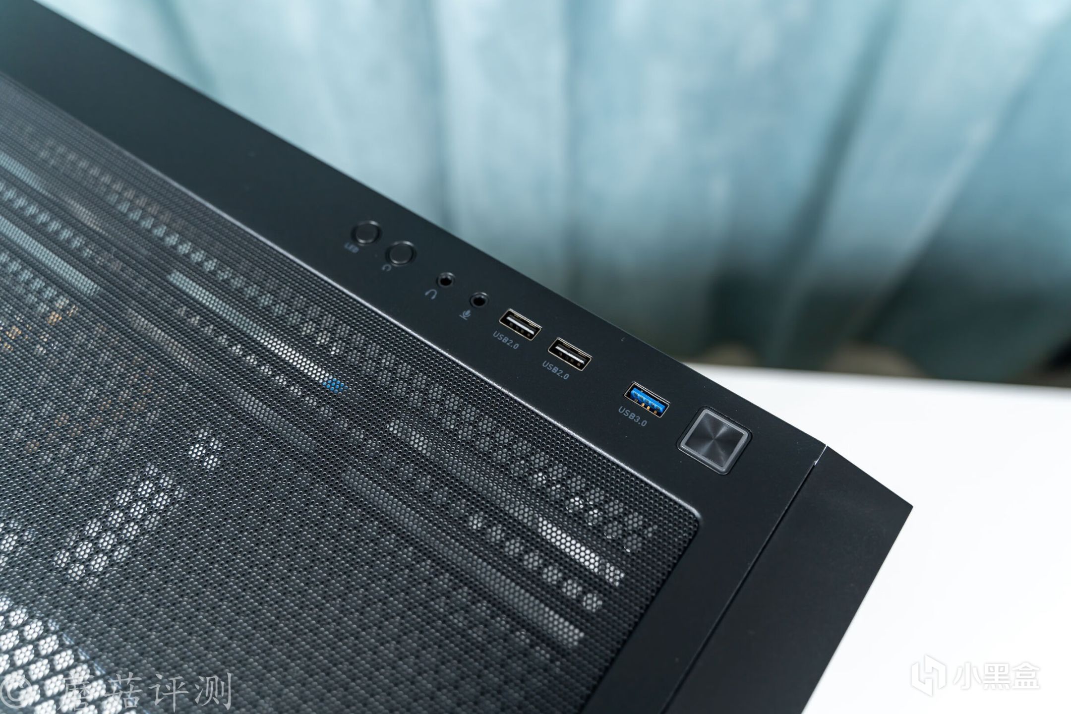 ▼旁边是机箱的IO面板,除了开机和重启键之外,还有一个USB 3.0接口、两个USB 2.0接口、两个音频接口和一个LED灯效调节按键。