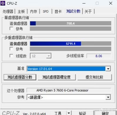 ▼简单跑个CPU-Z的测试,单核708.4、多核5711.1,感觉CPU-Z不太看好AMD。