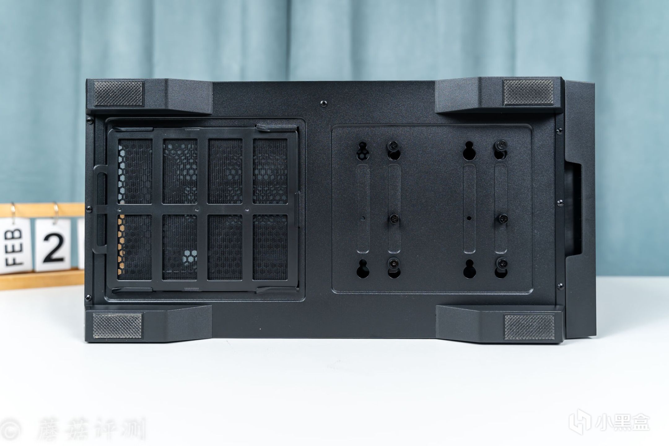 ▼机箱底部,四角有四个防滑脚垫,左侧是电源的防尘网,支持快拆。右侧是硬盘仓的固定位,有两个预留位置可以选择。