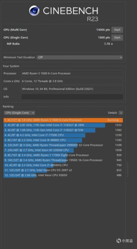 ▼跑个Cinebench R23,多线程得分14006、单线程得分1800,不错不错。