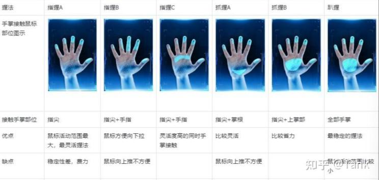 抓握玩家,接触鼠标的主要位置是指尖和掌根,抓握介于指握和趴握之间,既有指握灵活度高的优点,也有趴握省力的优点。