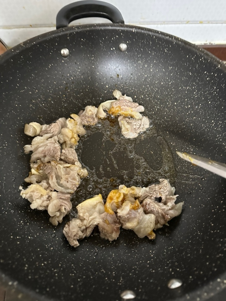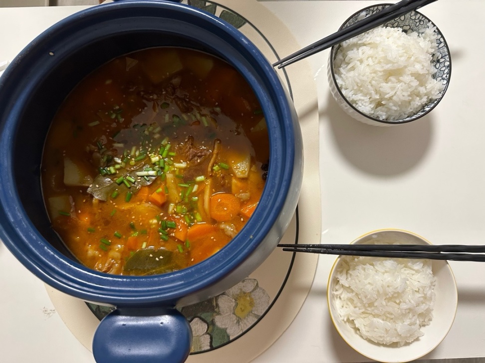 4.到时间以后加入土豆块,一小碗水(水根据汤得多少决定,汤多少加点水,汤少多加点水,别干锅了)然后加入两勺盐,一勺鸡精,继续小火慢炖半小时,出锅前根据口味尝尝味道做调整,最后加入葱花就能吃了