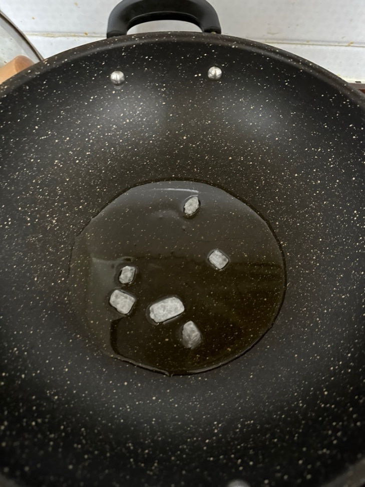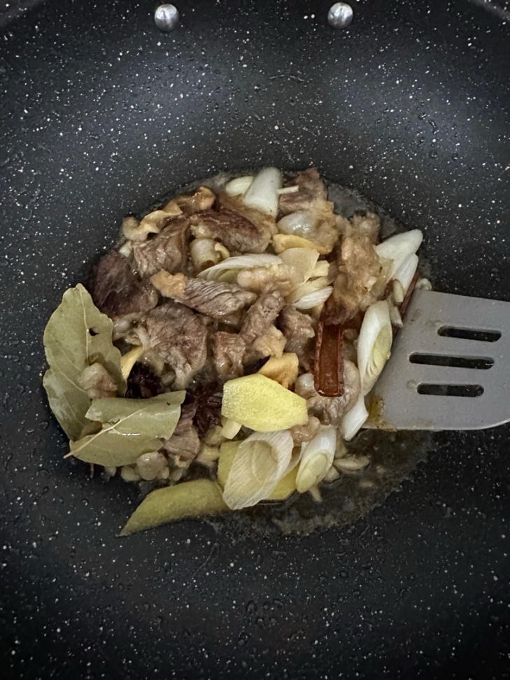 2.起锅烧油,牛肉尽量沥干水分,防止炒的时候溅油,锅内加入冰糖块,融化后倒入牛肉,翻炒,炒到变色加入葱姜蒜,桂皮八角香叶,继续翻炒,然后倒入少许料酒,炒到酒香味飘出,之前炒牛肉的水上火煮开,加入这一锅一起熬煮