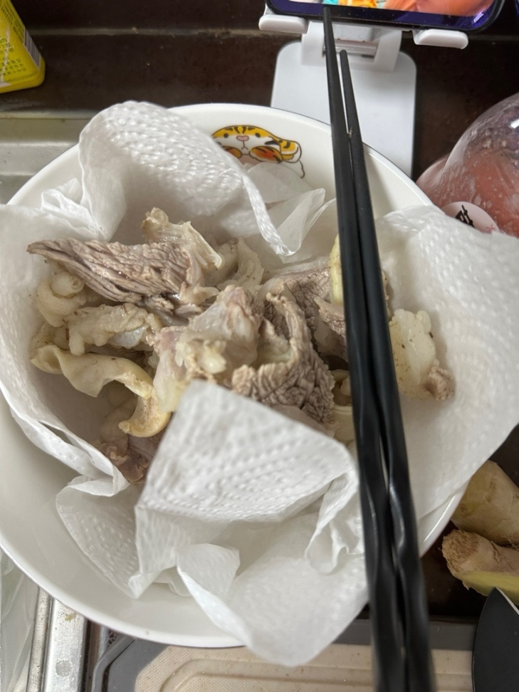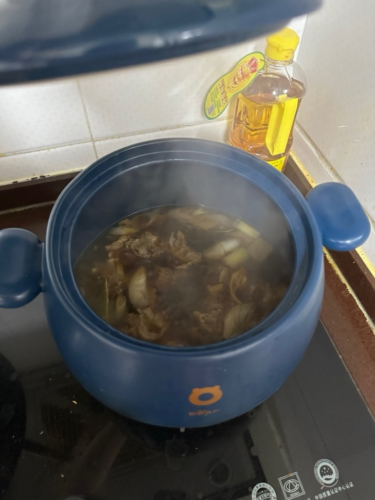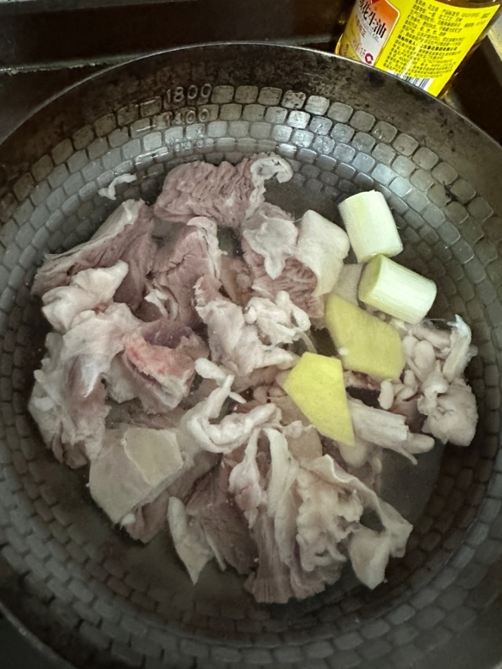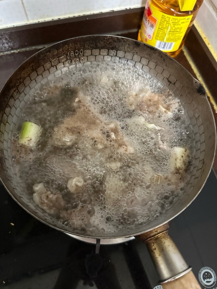 1.牛腩泡水除去血水,起锅烧水冷水下锅,同时加入料酒两勺,大葱段和生姜片,锅开撇去浮沫,牛肉捞出备用,煮牛肉的水倒入砂锅中(没有砂锅的就放在你要炖汤的锅里)记得撇干净浮沫