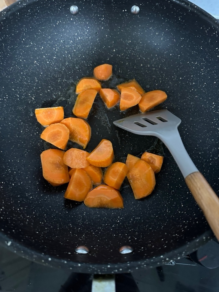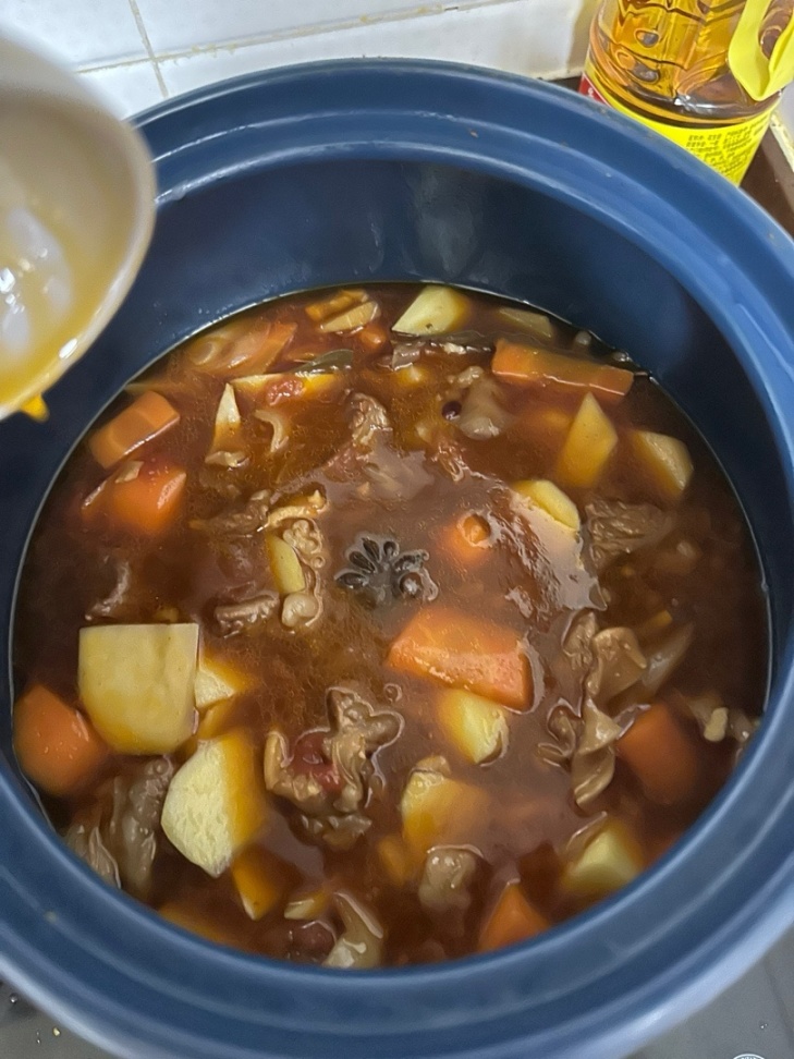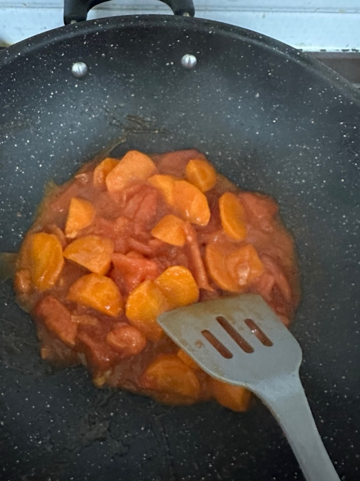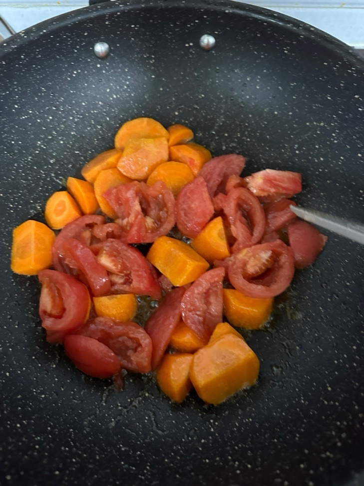 3.牛肉小火慢炖40分钟,然后另起锅烧油,加入胡萝卜翻炒,然后加入番茄,炒至番茄出汁,加入蚝油一勺,番茄酱少许,继续熬煮至番茄软烂成沙,然后倒入正在炖煮的牛肉锅里,搅拌均匀继续小火慢炖30分钟