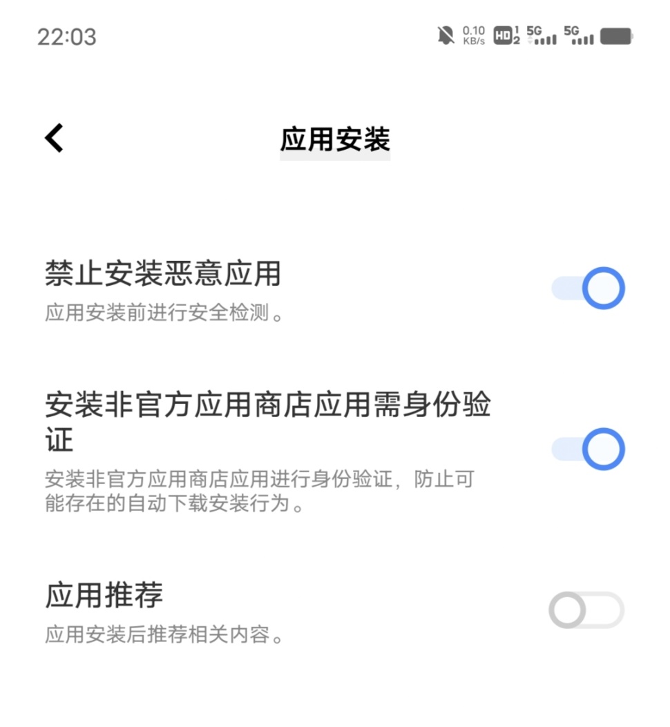 ✑安全→更多安全设置→应用安装→应用推荐(关闭)