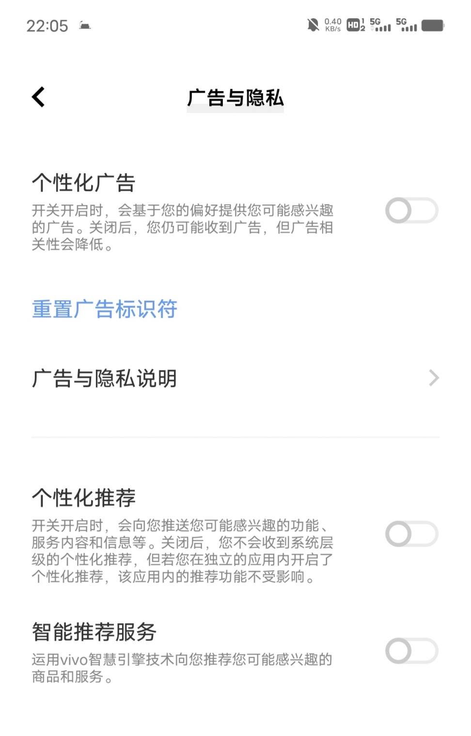 ✑安全→更多安全设置→广告与隐私(里面三个全部关闭,并且重置一下广告标识符)