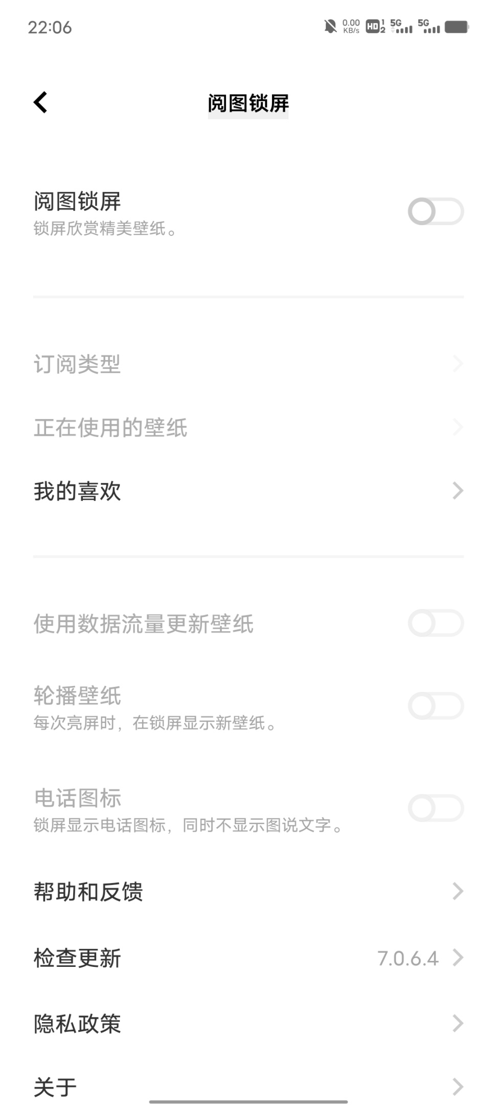 ✑桌面、锁屏与壁纸→锁屏设置→阅图锁屏(关闭)