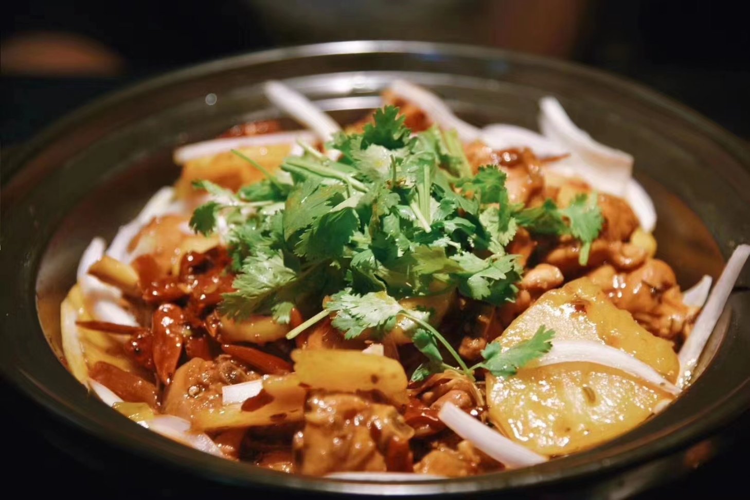 這道菜我認爲亮點就是花雕酒煮雞,去腥提鮮。然後又以洋蔥、青花椒、八角之類提味,又香又麻又醇,直叫人慾罷不能。雞肉嫩,土豆香,再加入油條泡汁(這道菜油條泡汁真的非常非常好喫。。。真的)食用,非常享受。